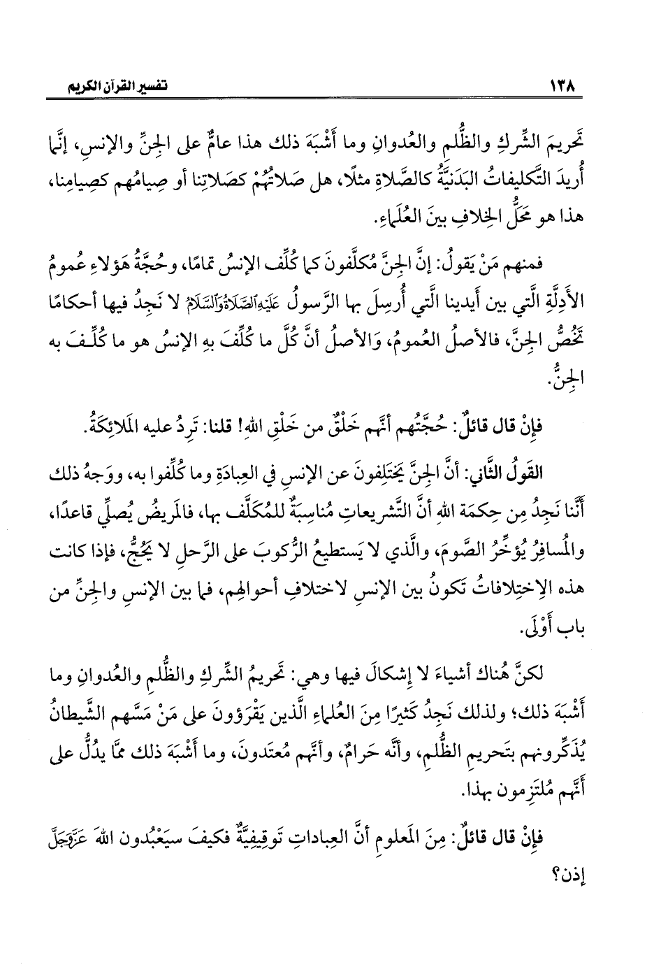 تَحريمَ الشِّركِ والظُّلمِ والعُدوانِ وما أَشْبَهَ ذلك هذا عامٌّ على الجِنِّ والإنسِ، إنَّما أُريدَ التَّكليفاتُ البَدَنيَّةُ كالصَّلاةِ مثلًا، هل صَلاتُهُمْ كصَلاتِنا أو صِيامُهم كصِيامِنا، هذا هو مَحَلُّ الخِلافِ بينَ العُلَماءِ.