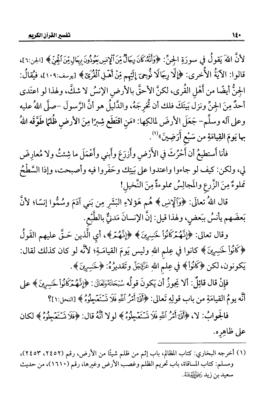 لأنَّ اللهَ يَقولُ في سورَةِ الجِنِّ: {وَأَنَّهُ كَانَ رِجَالٌ مِنَ الْإِنْسِ يَعُوذُونَ بِرِجَالٍ مِنَ الْجِنِّ} [الجن: ٦]، قالوا: الآيَةُ الأُخرى: {إِلَّا رِجَالًا نُوحِي إِلَيْهِمْ مِنْ أَهْلِ الْقُرَى} [يوسف: ١٠٩]، فيُقالُ: الجِنُّ أيضًا من أَهْلِ القُرى، لكنَّ الأحقَّ بالأرضِ الإنسُ لا شكَّ، ولهذا لو اعتَدى أحدٌ مِنَ الجِنِّ ونزل بَيتَكَ فلك أن تُخرِجَهُ، والدَّليلُ هو أنَّ الرَّسولَ -صلَّى اللهُ عليه وعلى آله وسلَّم- جَعَلَ الأرضَ لمالكِها: "مَنِ اقتَطَع شِبرًا مِنَ الأرضِ ظُلمًا طَوَّقَه اللهُ بها يَومَ القِيامَةِ من سَبع أَرَضِينَ" (¬١).