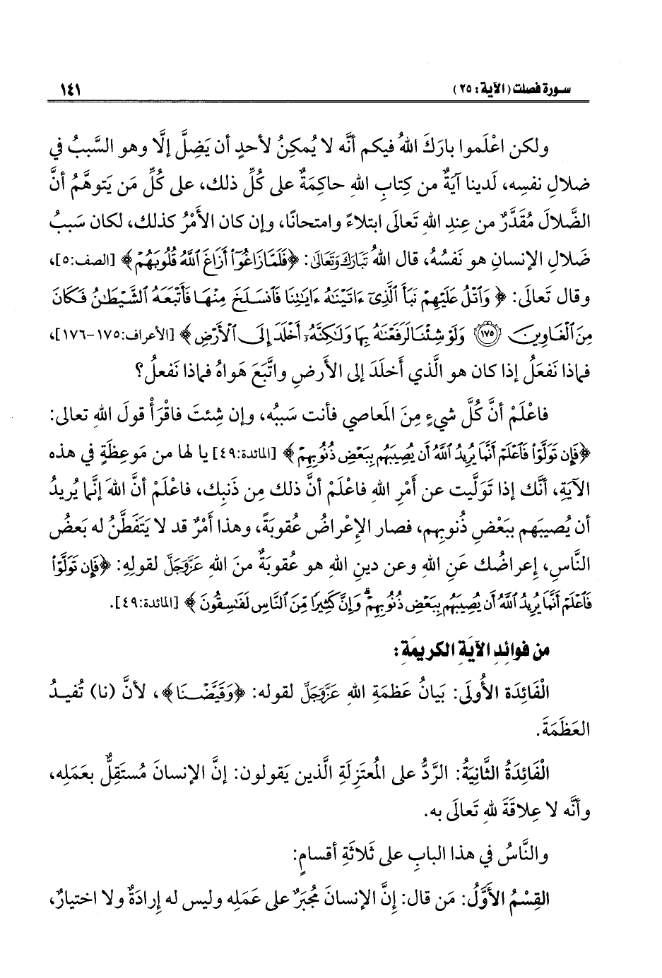 الْفَائِدَةُ الثَّانِيَةُ: الرَّدُّ على المُعتَزِلَةِ الَّذين يَقولون: إنَّ الإنسانَ مُستَقِلٌّ بعَمَلِه، وأنَّه لا عِلاقَةَ للهِ تَعالَى به.