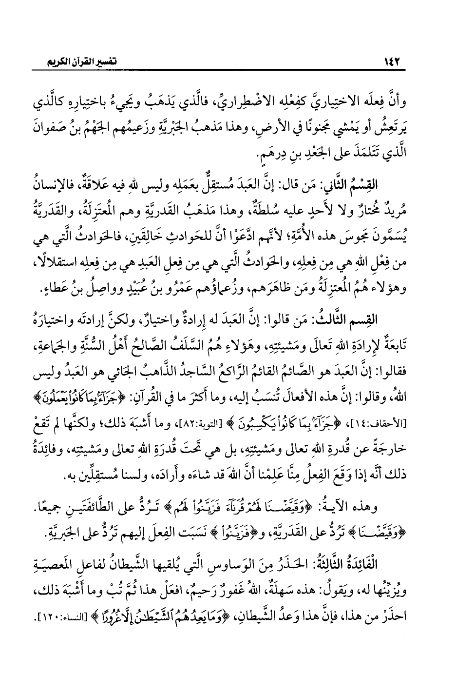 القِسم الثَّالثُ: مَن قالوا: إنَّ العَبدَ له إِرادةٌ واختيارٌ، ولكنَّ إرادتَه واختيارَهُ تَابعَةٌ لإِرادَةِ اللهِ تَعالَى ومَشيئتِهِ، وهَؤلاءِ هُمُ السَّلَفُ الصَّالحُ أَهلُ السُّنَّةِ والجَماعةِ، فقالوا: إنَّ العَبدَ هو الصَّائمُ القائمُ الرَّاكعُ السَّاجدُ الذَّاهبُ الجَائي هو العَبدُ وليس اللهُ، وقالوا: إنَّ هذه الأفعالَ تُنسَبُ إليه، وما أَكثرَ ما في القُرآنِ: {جَزَاءً بِمَا كَانُوا يَعْمَلُونَ} [الأحقاف: ١٤]، {جَزَاءً بِمَا كَانُوا يَكْسِبُونَ} [التوبة: ٨٢]، وما أَشبَهَ ذلك؛ ولكنَّها لم تَقعْ خارجَةً عن قُدرةِ اللهِ تعالى ومَشيئتِهِ، بل هي تَحتَ قُدرَةِ اللهِ تعالى ومَشيئتِه، وفائِدَةُ ذلك أنَّه إذا وَقَعَ الفِعلُ مِنَّا عَلِمْنا أنَّ اللهَ قد شاءَه وأَرادَه، ولسنا مُستقِلِّين به.