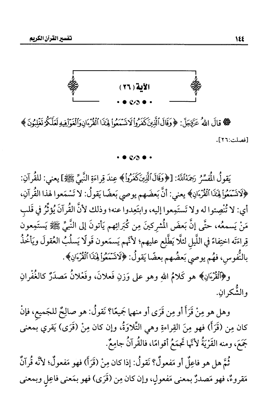 يَقولُ المُفسِّرُ رَحَمِهُ اللهُ: [{وَقَالَ الَّذِينَ كَفَرُوا} عِندَ قِراءَةِ النَّبيِّ - صلى الله عليه وسلم -، يعني: للقُرآنِ: {لَا تَسْمَعُوا لِهَذَا الْقُرْآنِ} يعني: أنَّ بَعضَهم يوصي بَعضًا يَقولُ: لا تَسْمَعوا لهذا القُرآنِ، أي: لا تُنْصِتوا له ولا تَستَمِعوا إليه، وابتَعِدوا عنه؛ وذلك لأنَّ القُرآنَ يُؤثِّرُ في قَلبِ مَنْ يَسمعُه، حتَّى إنَّ بَعضَ المُشرِكينَ مِن كُبَرائِهم يَأتونَ إلى النَّبيِّ - صلى الله عليه وسلم - يَستَمِعون قِراءَتَه اختِفاءً في اللَّيلِ لئلَّا يَطَّلِع عليهم؛ لأنَّهم يَسمَعون قَولًا يَسلُبُ العُقولَ ويَأخُذُ بالنُّفوسِ، فهُم يوصي بَعضُهم بعضًا يَقولُ: {لَا تَسْمَعُوا لِهَذَا الْقُرْآنِ}.
