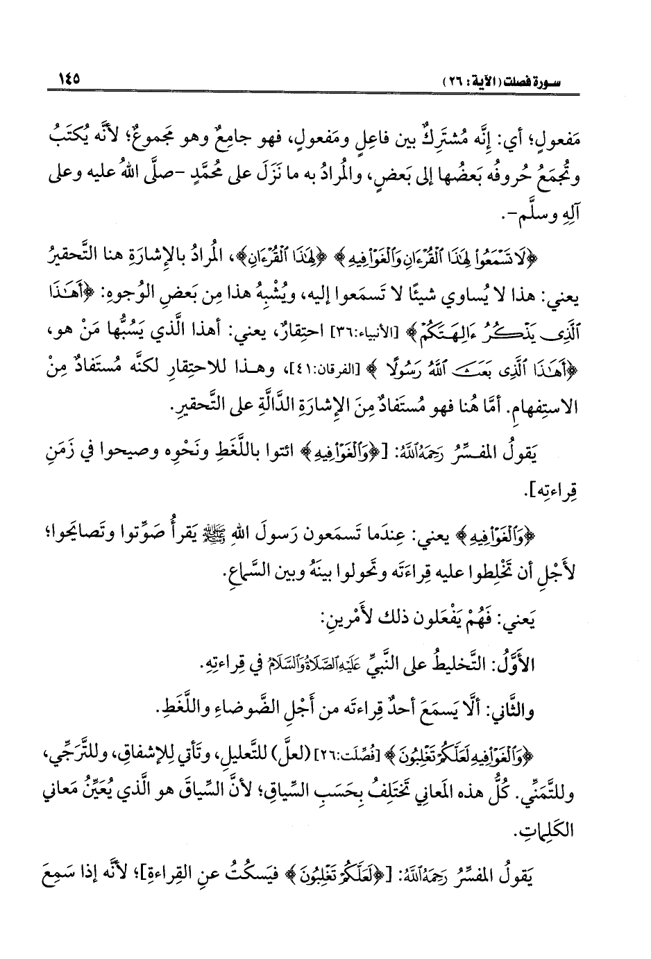 يَقولُ المفسِّرُ رَحِمَهُ اللهُ: [{وَالْغَوْا فِيهِ} ائتوا باللَّغَطِ ونَحْوِه وصيحوا في زَمَنِ قِراءتِه].