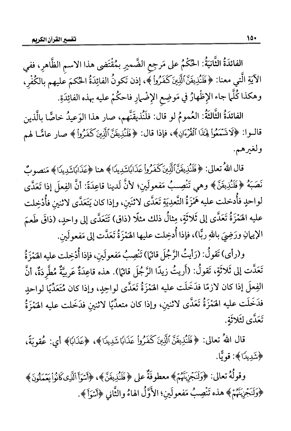 قال اللهُ تعالى: {فَلَنُذِيقَنَّ الَّذِينَ كَفَرُوا عَذَابًا شَدِيدًا} هنا {عَذَابًا شَدِيدًا} مَنصوبٌ نَصَبَهُ {فَلَنُذِيقَنَّ} وهي تَنْصِبُ مَفعولَينِ؛ لأنَّ لَدينا قاعِدَةً: أنَّ الفِعلَ إذا تَعَدَّى لواحدٍ فأُدخلت عليه هَمْزَةُ التَّعدِيَةِ تَعَدَّى لاثنَينِ، وإذا كان يَتَعَدَّى لاثنينِ فأُدْخِلت عليه الهَمْزَةُ تَعَدَّى إلى ثَلاثَةٍ، مِثالُ ذلك مثلًا (ذاق) تَتَعَدَّى إلى واحدٍ، (ذاقَ طَعمَ الإيمانِ ورَضِيَ باللهِ ربًّا)، فإذا أُدخِلت عليها الهَمْزَةُ تَعَدَّت إلى مَفعولَينِ.