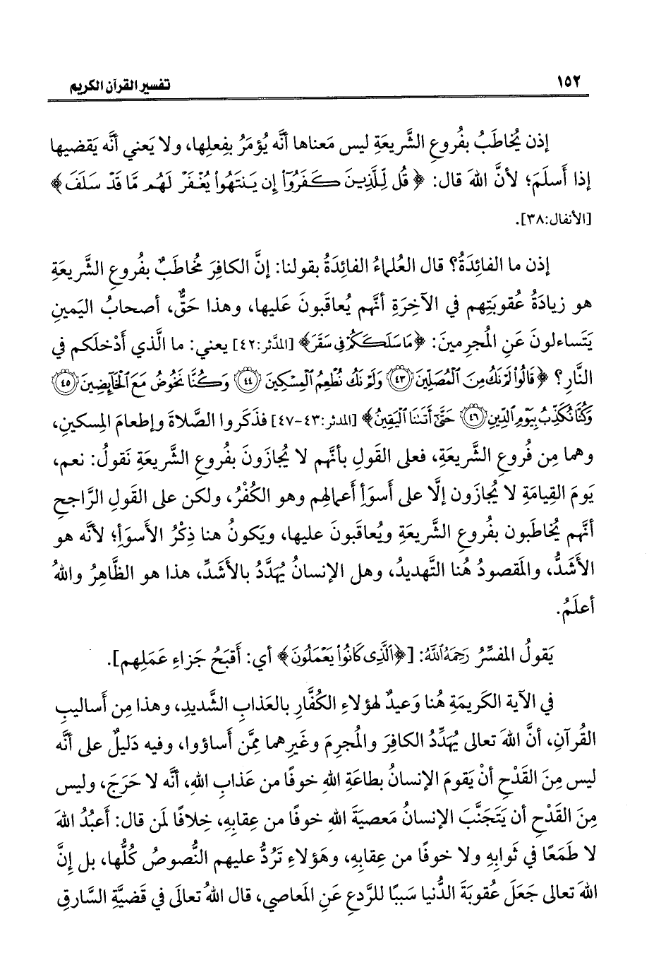 إذن ما الفائِدَةُ؟ قال العُلماءُ الفائِدَةُ بقولنا: إنَّ الكافِرَ مُخاطَبٌ بفُروعِ الشَّريعَةِ هو زيادَةُ عُقوبَتِهم في الآخِرَةِ أنَّهم يُعاقَبونَ عَليها، وهذا حَقٌّ، أصحابُ اليَمينِ يَتَساءلونَ عَنِ المُجرِمينَ: {مَا سَلَكَكُمْ فِي سَقَرَ} [المدَّثر: ٤٢] يعني: ما الَّذي أَدْخلَكم في النَّارِ؟ {قَالُوا لَمْ نَكُ مِنَ الْمُصَلِّينَ (٤٣) وَلَمْ نَكُ نُطْعِمُ الْمِسْكِينَ (٤٤) وَكُنَّا نَخُوضُ مَعَ الْخَائِضِينَ (٤٥) وَكُنَّا نُكَذِّبُ بِيَوْمِ الدِّينِ (٤٦) حَتَّى أَتَانَا الْيَقِينُ} [المدثر: ٤٣ - ٤٧]، فذَكَروا الصَّلاةَ وإطعامَ المِسكينِ، وهما مِن فُروعِ الشَّريعَةِ، فعلى القَولِ بأنَّهم لا يُجازَونَ بفُروعِ الشَّريعَةِ نَقولُ: نعم، يَومَ القِيامَةِ لا يُجازَون إلَّا على أَسوَأِ أَعمالِهم وهو الكُفْرُ، ولكن على القَولِ الرَّاجحِ أنَّهم يُخاطَبون بفُروعِ الشَّريعَةِ ويُعاقَبونَ عليها، ويَكونُ هنا ذِكْرُ الأَسوَأِ؛ لأنَّه هو الأَشَدُّ، والمَقصودُ هُنا التَّهديدُ، وهل الإنسانُ يُهَدَّدُ بالأَشَدِّ، هذا هو الظَّاهِرُ واللهُ أعلَمُ.