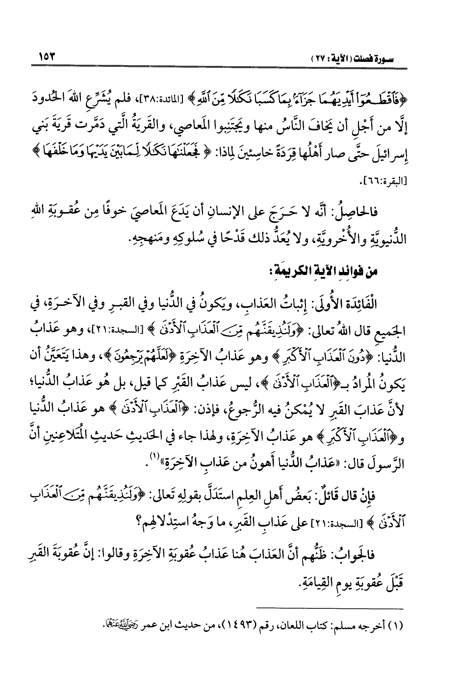 الْفَائِدَة الأُولَى: إِثباتُ العَذابِ، وَيكونُ في الدُّنيا وفي القبرِ وفي الآخرَةِ، في الجَميعِ قال اللهُ تعالى: {وَلَنُذِيقَنَّهُمْ مِنَ الْعَذَابِ الْأَدْنَى} [السجدة: ٢١]، وهو عَذابُ الدُّنيا: {دُونَ الْعَذَابِ الْأَكْبَرِ} وهو عَذابُ الآخِرَةِ {لَعَلَّهُمْ يَرْجِعُونَ}، وهذا يَتَعَيَّنُ أن يَكونُ المُرادُ بـ {الْعَذَابِ الْأَدْنَى}، ليس عَذابُ القَبْرِ كما قيل، بل هُو عَذابُ الدُّنيا؛ لأنَّ عَذابَ القَبرِ لا يُمْكنُ فيه الرُّجوعُ، فإذن: {الْعَذَابِ الْأَدْنَى} هو عَذابُ الدُّنيا و {الْعَذَابِ الْأَكْبَرِ} هو عَذابُ الآخِرَةِ، ولهذا جاء في الحَديثِ حَديثِ المُتَلاعِنينِ أنَّ الرَّسولَ قال: "عَذابُ الدُّنيا أَهونُ من عَذابِ الآخِرَةِ" (¬١).
