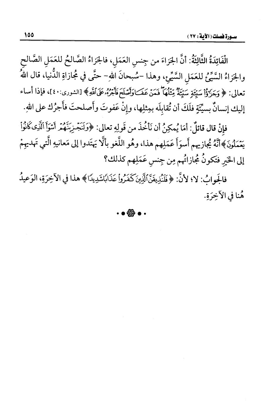 الْفَائِدَةُ الثَّالِثَةُ: أنَّ الجَزاءَ من جِنسِ العَمَلِ، فالجَزاءُ الصَّالحُ للعَمَلِ الصَّالحِ والجَزاءُ السَّيِّئُ للعَمَلِ السَّيِّئِ، وهذا - سُبحانَ اللهِ - حتَّى في مجُازاةِ الدُّنيا، قال اللهُ تعالى: {وَجَزَاءُ سَيِّئَةٍ سَيِّئَةٌ مِثْلُهَا فَمَنْ عَفَا وَأَصْلَحَ فَأَجْرُهُ عَلَى اللَّهِ} [الشورى: ٤٠]، فإذا أساء إليك إنسانٌ بسيِّئَةٍ فلَكَ أن تُقابِلَه بمِثلِها، وإِنْ عَفوتَ وأَصلحتَ فأَجرُك على اللهِ.