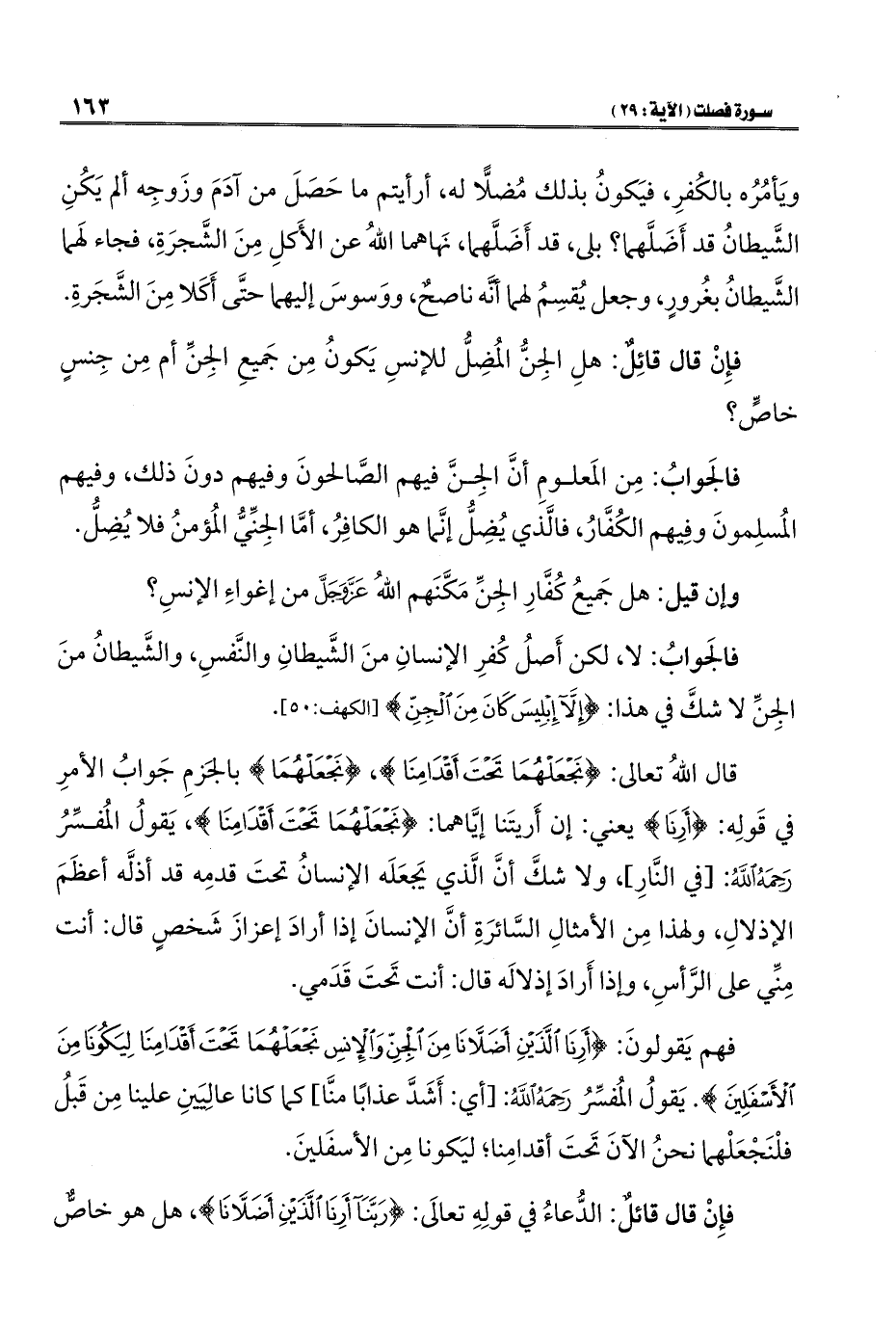 فهم يَقولونَ: {أَرِنَا اللَّذَيْنِ أَضَلَّانَا مِنَ الْجِنِّ وَالْإِنْسِ نَجْعَلْهُمَا تَحْتَ أَقْدَامِنَا لِيَكُونَا مِنَ الْأَسْفَلِينَ}. يَقولُ المُفسِّرُ رَحِمَهُ اللَّهُ: [أي: أَشَدَّ عذابًا منَّا] كما كانا عالِيَينِ علينا مِن قَبلُ فلْنَجْعَلْهما نحنُ الآنَ تَحتَ أقدامِنا؛ ليَكونا مِن الأسفَلينَ.