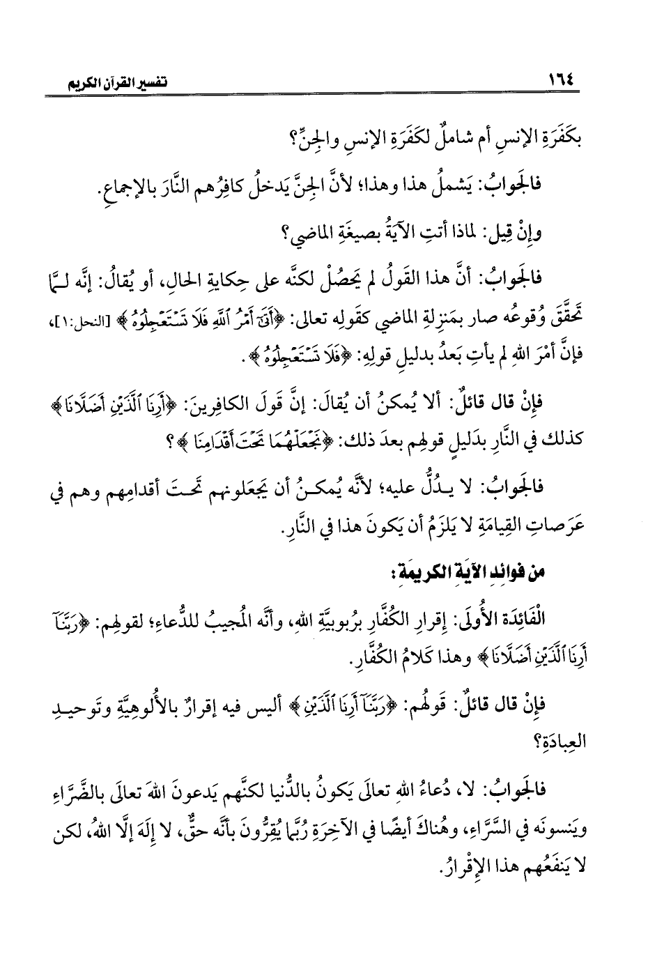 فإِنْ قال قائلٌ: ألا يُمكنُ أن يُقالَ: إنَّ قَولَ الكافِرينَ: {أَرِنَا اللَّذَيْنِ أَضَلَّانَا} كذلك في النَّارِ بدَليلٍ قولهِم بعدَ ذلك: {نَجْعَلْهُمَا تَحْتَ أَقْدَامِنَا}؟