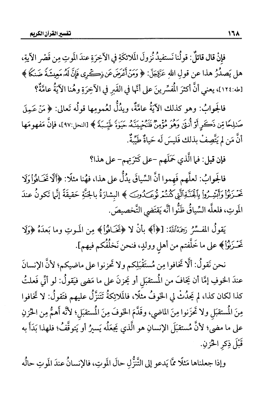 فإِنْ قال قائلٌ: قولُنا نَستفيدُ نُزولَ المَلائكَةِ في الآخِرَةِ عندَ المَوتِ مِن قَصْر الآيةِ، هل يَصدُرُ هذا عن قولِ اللهِ عَزَّ وَجَلَّ: {وَمَنْ أَعْرَضَ عَنْ ذِكْرِي فَإِنَّ لَهُ مَعِيشَةً ضَنْكًا} [طه: ١٢٤]، يعني أنَّ أكثرَ المُفسِّرينَ على أنَّها في القَبرِ في الآخِرَةِ وهُنا الآيَةُ عامَّةٌ؟