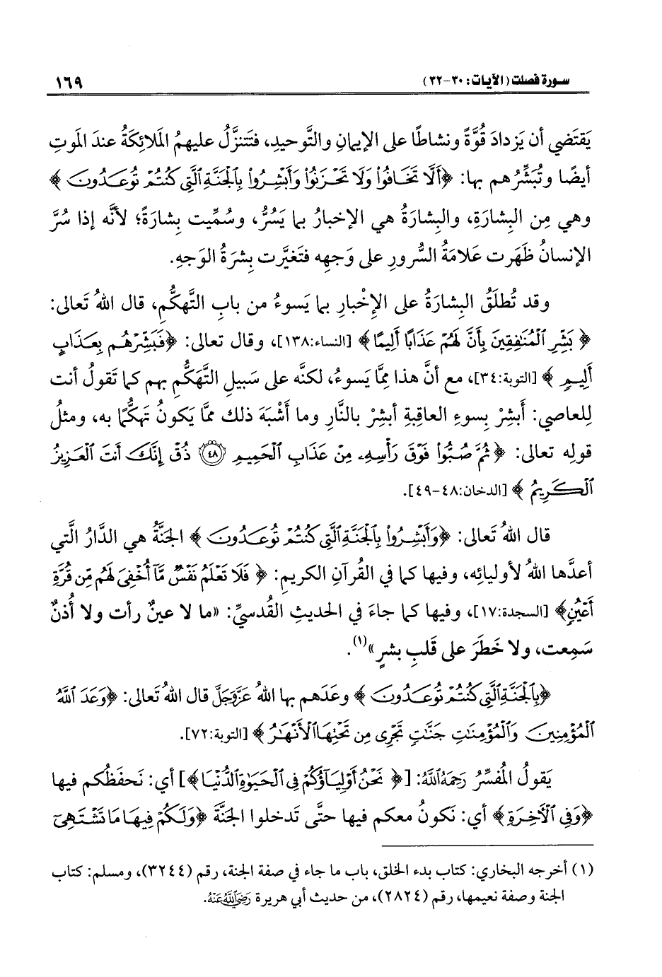 يَقتَضي أن يَزدادَ قُوَّةً ونشاطًا على الإيمانِ والتَّوحيدِ، فتَتنزَّلُ عليهمُ المَلائِكَةُ عندَ المَوتِ أيضًا وتُبَشِّرُهم بها: {أَلَّا تَخَافُوا وَلَا تَحْزَنُوا وَأَبْشِرُوا بِالْجَنَّةِ الَّتِي كُنْتُمْ تُوعَدُونَ} وهي مِن البِشارَةِ، والبِشارَةُ هي الإخبارُ بما يَسُرُّ، وسُمِّيت بِشارَةً؛ لأنَّه إذا سُرَّ الإنسانُ ظَهَرت عَلامَةُ السُّرورِ على وَجهِه فتَغيَّرت بِشرَةُ الوَجهِ.