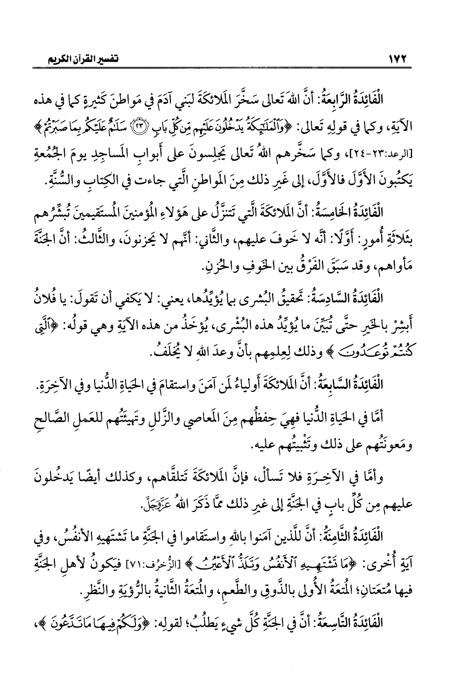 الْفَائِدَةُ الثَّامِنَةُ: أنَّ للَّذين آمَنوا باللهِ واستَقاموا في الجَنَّةِ ما تَشتَهيهِ الأنفُسُ، وفي آيَهٍ أُخْرى: {مَا تَشْتَهِيهِ الْأَنْفُسُ وَتَلَذُّ الْأَعْيُنُ} [الزخرف: ٧١] فيَكونُ لأهلِ الجَنَّةِ فيها مُتعَتانِ؛ المُتعَةُ الأُولى بالذَّوقِ والطَّعمِ، والمُتعَةُ الثَّانيةُ بالرُّؤَيةِ والنَّظرِ.