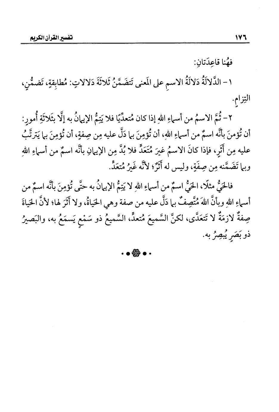 ٢ - ثُمَّ الاسمُ من أسماءِ اللهِ إذا كان مُتعدِّيًا فلا يَتِمُّ الإيمانُ به إلَّا بثَلاثَةِ أُمورٍ: أن تُؤمنَ بأنَّه اسمٌ من أسماءِ اللهِ، أن تُؤمِنَ بما دَلَّ عليه مِن صِفةٍ، أن تُؤمِنَ بما يَترتَّبُ عليه مِن أَثَرٍ، فإذا كانَ الاسمُ غيرَ مُتَعَدٍّ فلا بُدَّ مِن الإيمانِ بأنَّه اسمٌ من أسماءِ اللهِ وبما تَضَمَّنه مِن صِفَةٍ، وليس له أَثَرٌ؛ لأنَّه غَيرُ مُتعَدٍّ.