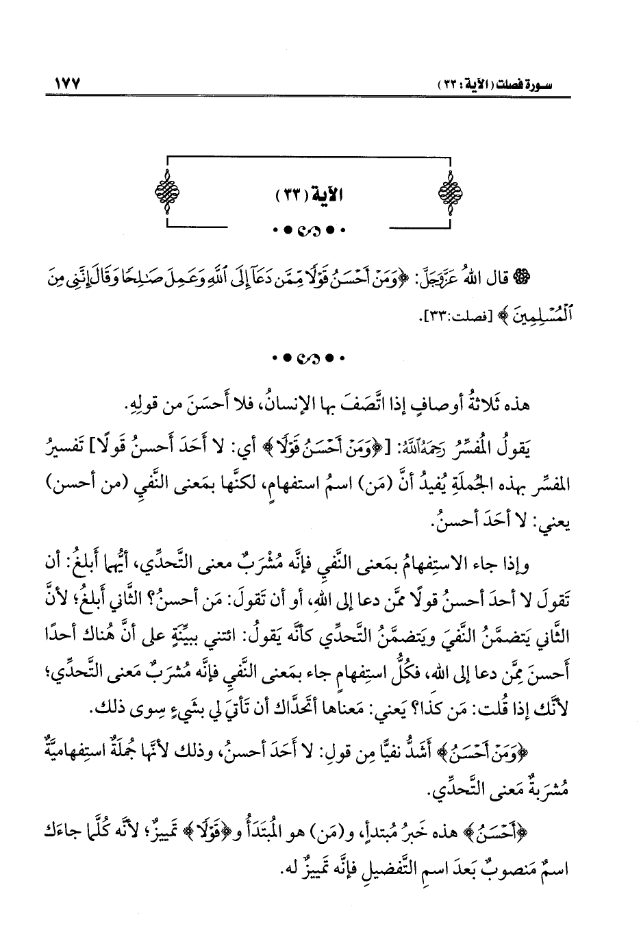 يَقولُ المُفسِّرُ رَحِمَهُ اللَّهُ: [{وَمَنْ أَحْسَنُ قَوْلًا} أي: لا أَحَدَ أَحسنُ قَولًا] تَفسيرُ المفسِّر بهذه الجُملَةِ يُفيدُ أنَّ (مَن) اسمُ استفهامٍ، لكنَّها بمَعنى النَّفيِ (من أحسن) يعني: لا أحَدَ أحسنُ.