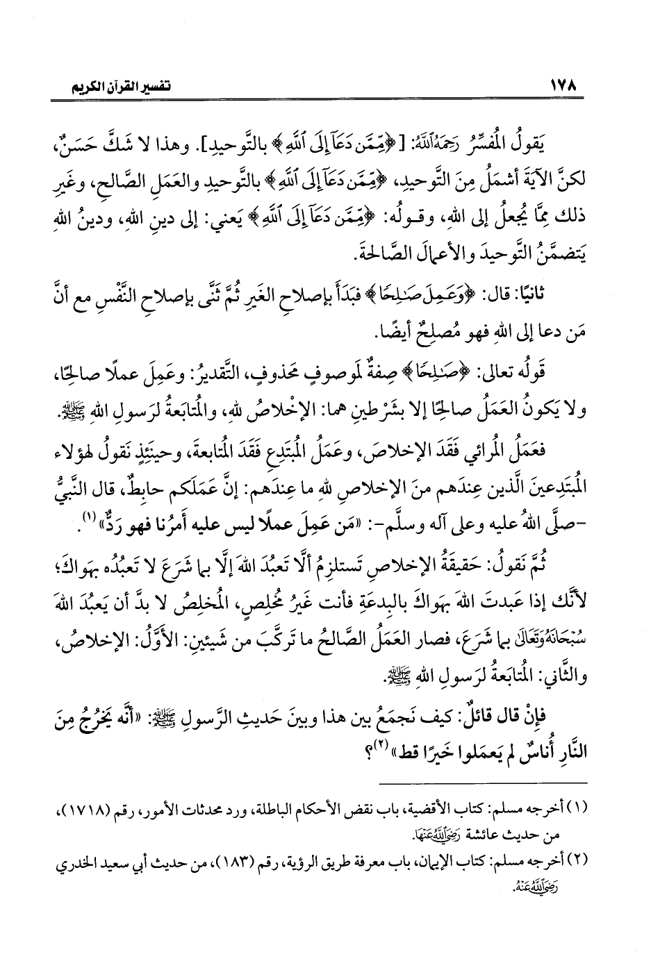 يَقولُ المُفسِّرُ رَحِمَهُ اللَّهُ: [{مِمَّنْ دَعَا إِلَى اللَّهِ} بالتَّوحيدِ]. وهذا لا شَكَّ حَسَنٌ، لكنَّ الآيَةَ أشمَلُ مِنَ التَّوحيدِ، {مِمَّنْ دَعَا إِلَى اللَّهِ} بالتَّوحيدِ والعَمَلِ الصَّالحِ، وغَيرِ ذلك مِمَّا يُجعلُ إلى اللهِ، وقولُه: {مِمَّنْ دَعَا إِلَى اللَّهِ} يَعني: إلى دينِ اللهِ، ودينُ اللهِ يَتضمَّنُ التَّوحيدَ والأعمالَ الصَّالحةَ.