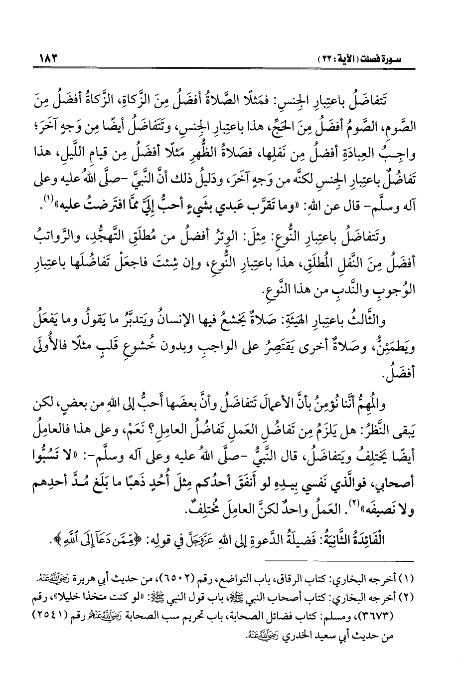 والمُهِمُّ أنَّنا نُؤمِنُ بأنَّ الأعمالَ تَتفاضَلُ وأنَّ بعضَها أَحبُّ إلى اللهِ من بعضٍ، لكن يَبقى النَّظرُ: هل يَلزَمُ مِن تَفاضُلِ العَملِ تَفاضُلُ العامِلِ؟ نَعَمْ، وعلى هذا فالعامِلُ أيضًا يَختلِفُ ويَتفاضَلُ، قال النَّبيُّ - صلَّى اللهُ عليه وعلى آله وسلَّم -: "لا تَسُبُّوا أصحابي، فوالَّذي نَفسي بِيدِهِ لو أَنفَقَ أحدُكم مِثلَ أُحُدٍ ذَهبًا ما بَلَغ مُدَّ أحدِهم ولا نَصيفَه" (¬٢). العَملُ واحدٌ لكنَّ العامِلَ مخُتلِفٌ.