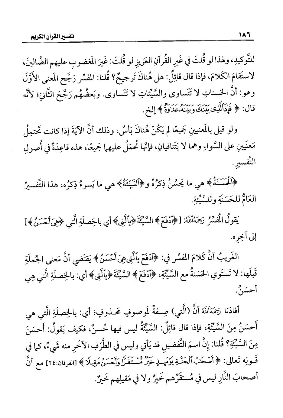 للتَّوكيدِ، ولهذا لو قُلتَ في غَيرِ القُرآنِ العَزيزِ لو قُلتَ: غَيرَ المَغضوبِ عليهم الضَّالينَ، لاستَقامَ الكَلامَ، فإذا قال قائِلٌ: هل هُناكَ تَرجيحٌ؟ قُلنا: المفسِّر رَجَّح المَعنى الأَوَّلَ وهو: أنَّ الحَسناتِ لا تَتَساوى والسَّيِّئاتِ لا تَتَساوى. وبَعضُهُم رَجَّحَ الثَّانيَ؛ لأنَّه قال: {فَإِذَا الَّذِي بَيْنَكَ وَبَيْنَهُ عَدَاوَةٌ} إلخ.