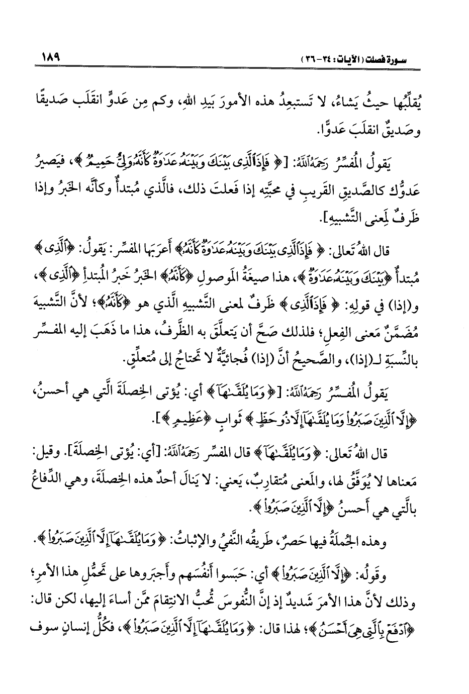 يَقولُ المُفسِّرُ رَحِمَهُ اللَّهُ: [{وَمَا يُلَقَّاهَا} أي: يُؤتى الخِصلَةَ الَّتي هي أحسنُ، {إِلَّا الَّذِينَ صَبَرُوا وَمَا يُلَقَّاهَا إِلَّا ذُو حَظٍّ} ثَوابٍ {عَظِيمٍ}].