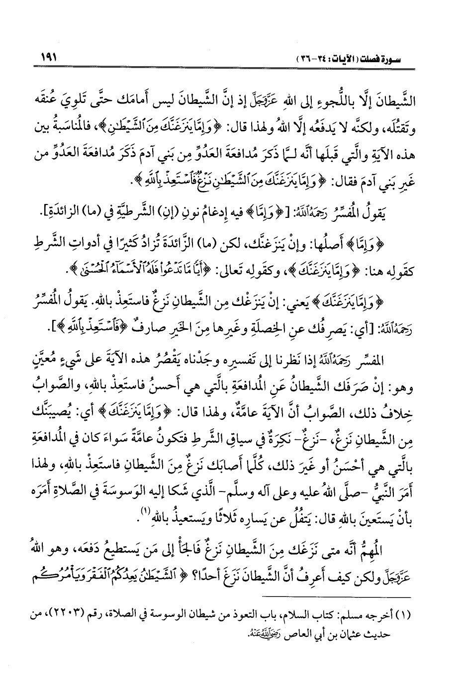 المفسِّر رَحِمَهُ اللَّهُ إذا نَظرنا إلى تَفسيرِه وجَدْناه يَقْصُرُ هذه الآيَةِ على شَيءٍ مُعيَّنٍ وهو: إنْ صَرَفَك الشَّيطانُ عَنِ المُدافعَةِ بالَّتي هي أَحسنُ فاستَعِذْ باللهِ، والصَّوابُ خِلافُ ذلك، الصَّوابُ أنَّ الآيَةَ عامَّةٌ، ولهذا قال: {وَإِمَّا يَنْزَغَنَّكَ} أي: يُصيبَنَّك مِن الشَّيطانِ نَزغٌ، -نَزغٌ- نَكِرَةٌ في سياقِ الشَّرطِ فتكونُ عامَّةً سَواءَ كان في المُدافعَةِ بالَّتي هي أحْسَنُ أو غَيرَ ذلك، كُلَّما أَصابَك نَزغٌ مِنَ الشَّيطانِ فاستَعِذْ باللهِ، ولهذا أَمَرَ النَّبيُّ -صلَّى اللهُ عليه وعلى اله وسلَّم- الَّذي شَكا إليه الوَسوسَةَ في الصَّلاةِ أَمَرَه بأنْ يَستَعينَ باللهِ قال: يَتفُلُ عن يَسارِه ثَلاثًا ويَستعيذُ باللهِ (¬١).