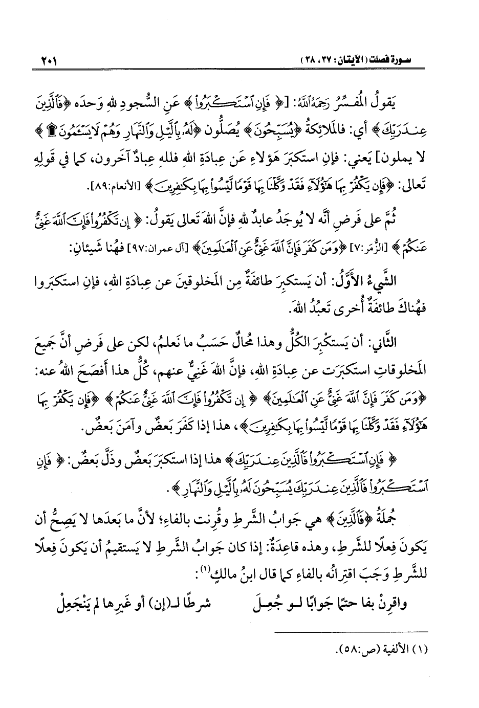 يَقولُ المُفسِّرُ رَحِمَهُ اللَّهُ: [{فَإِنِ اسْتَكْبَرُوا} عَنِ السُّجودِ للهِ وَحدَه {فَالَّذِينَ عِنْدَ رَبِّكَ} أي: فالمَلائِكةُ {يُسَبِّحُونَ} يُصَلُّون {لَهُ بِاللَّيْلِ وَالنَّهَارِ وَهُمْ لَا يَسْأَمُونَ} لا يملون] يَعني: فإنِ استَكبَرَ هَؤلاءِ عَن عِبادَةِ اللهِ فللهِ عِبادٌ آخَرون، كما في قَولِهِ تَعالى: {فَإِنْ يَكْفُرْ بِهَا هَؤُلَاءِ فَقَدْ وَكَّلْنَا بِهَا قَوْمًا لَيْسُوا بِهَا بِكَافِرِينَ} [الأنعام: ٨٩].