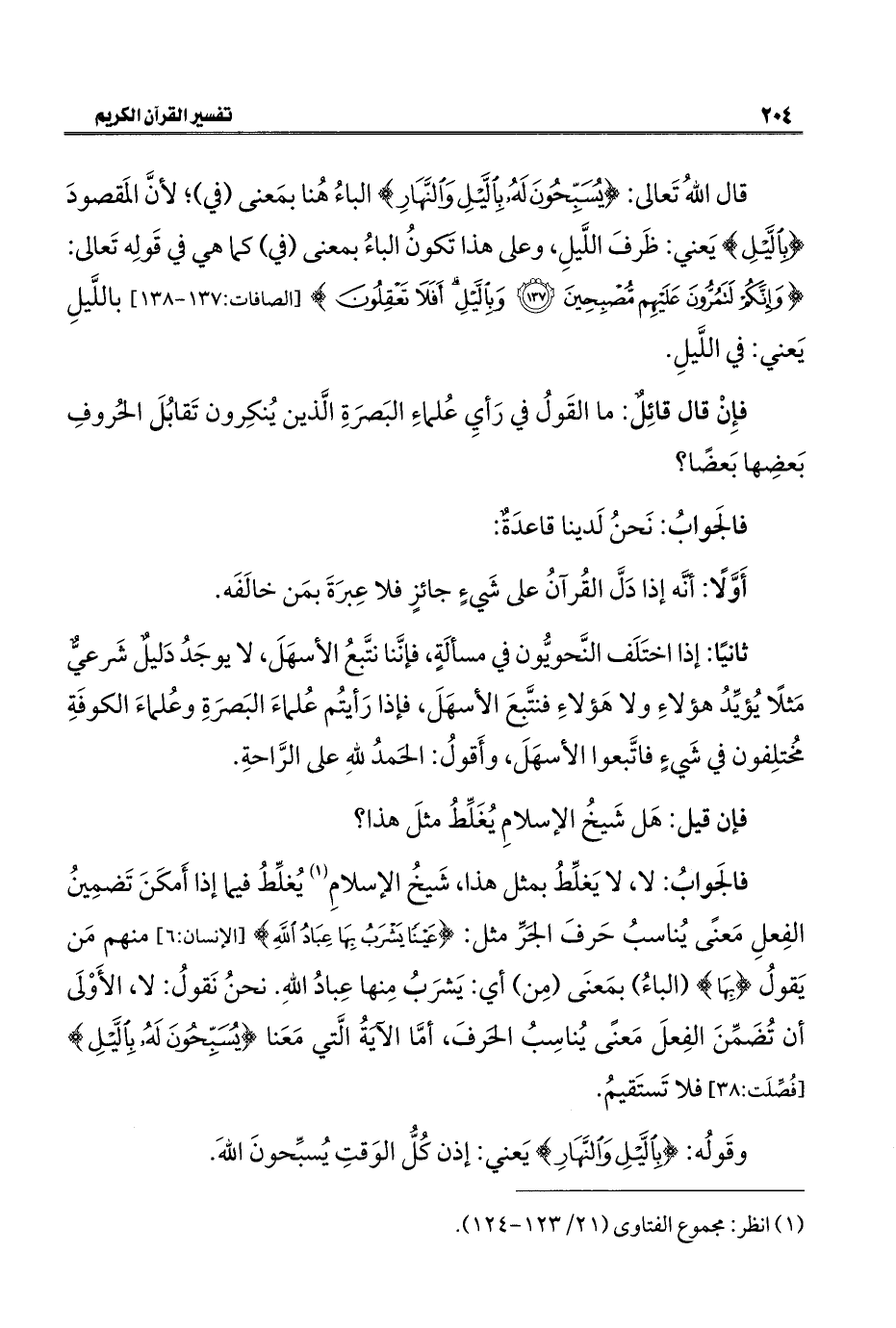 فالجَوابُ: لا، لا يَغلِّطُ بمثل هذا، شَيخُ الإسلامِ (¬١) يُغلِّطُ فيما إذا أَمكَنَ تَضمِينُ الفِعلِ مَعنًى يُناسبُ حَرفَ الجَرِّ مثل: {عَيْنًا يَشْرَبُ بِهَا عِبَادُ اللَّهِ} [الإنسان: ٦] منهم مَن يَقولُ {بِهَا} (الباءُ) بمَعنَى (مِن) أي: يَشرَبُ مِنها عِبادُ اللهِ. نحنُ نَقولُ: لا، الأَوْلَى أن تُضَمِّنَ الفِعلَ مَعنًى يُناسِبُ الحَرفَ، أمَّا الآيَةُ الَّتي مَعَنا {يُسَبِّحُونَ لَهُ بِاللَّيْلِ} [فصلت: ٣٨] فلا تَستَقيمُ.