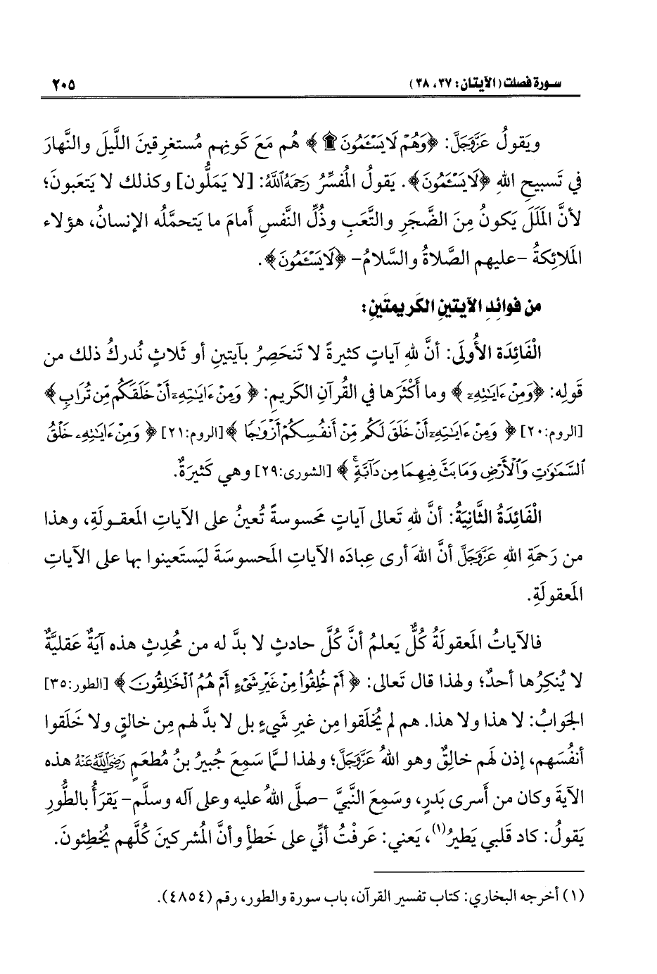 فالآياتُ المَعقولَةُ كُلٌّ يَعلمُ أنَّ كُلَّ حادثٍ لا بدَّ له من محُدِثٍ هذه آيَةٌ عَقليَّةٌ لا يُنكِرُها أحدٌ؛ ولهذا قال تَعالى: {أَمْ خُلِقُوا مِنْ غَيْرِ شَيْءٍ أَمْ هُمُ الْخَالِقُونَ} [الطور: ٣٥] الجَوابُ: لا هذا ولا هذا. هم لم يُخلَقوا مِن غيرِ شَيءٍ بل لا بدَّ لهم مِن خالقٍ ولا خَلَقوا أنفُسَهم، إذن لَهم خالِقٌ وهو اللهُ عَزَّ وَجَلَّ؛ ولهذا لمَّا سَمِعَ جُبيرُ بنُ مُطعَمٍ - رضي الله عنه - هذه الآيةَ وكان من أَسرى بَدرٍ، وسَمِعَ النَبيَّ - صلَّى اللهُ عليه وعلى آله وسلَّم - يَقرَأُ بالطُّورِ يَقولُ: كاد قَلبي يَطيرُ (¬١)، يَعني: عَرفْتُ أنَي على خَطأٍ وأنَ المُشركينَ كُلَّهم يُخطِئونَ.