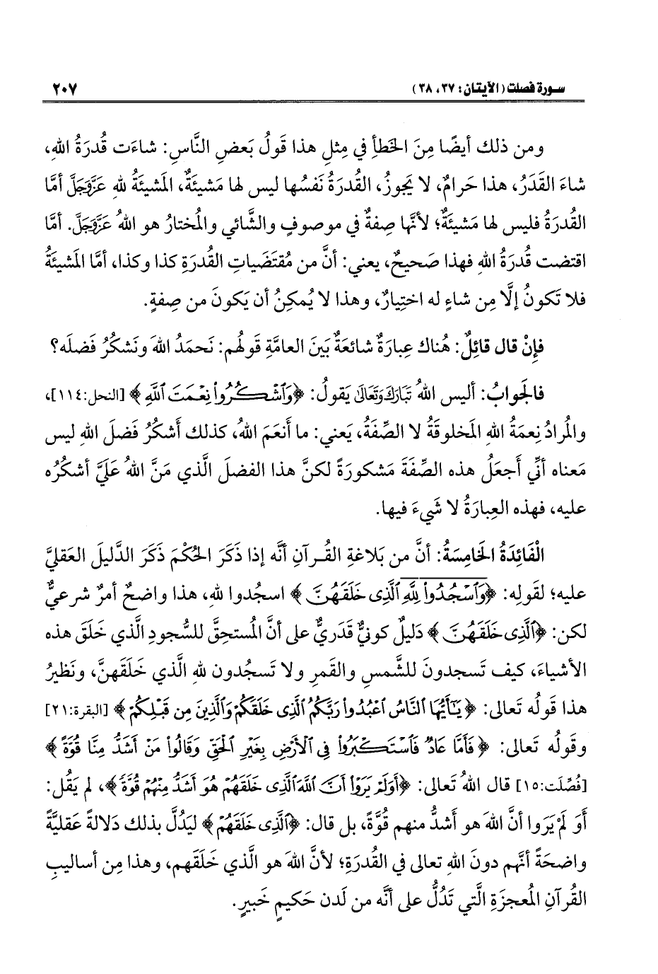 الْفَائِدَةُ الخَامِسَةُ: أنَّ من بَلاغةِ القُرآنِ أنَّه إذا ذَكَرَ الحُكْمَ ذَكَرَ الدَّليلَ العَقليَّ عليه؛ لقَولِه: {وَاسْجُدُوا لِلَّهِ الَّذِي خَلَقَهُنَّ} اسجُدوا للهِ، هذا واضح أمرٌ شرعيٌّ لكن: {الَّذِي خَلَقَهُنَّ} دَليلٌ كونيٌّ قَدَريٌّ على أنَّ المُستحِقَّ للسُّجودِ الَّذي خَلَقَ هذه الأشياءَ، كيف تَسجدونَ للشَّمسِ والقَمرِ ولا تَسجُدون للهِ الَّذي خَلَقَهنَّ، ونَظيرُ هذا قَولُه تَعالى: {يَاأَيُّهَا النَّاسُ اعْبُدُوا رَبَّكُمُ الَّذِي خَلَقَكُمْ وَالَّذِينَ مِنْ قَبْلِكُمْ} [البقرة: ٢١] وقَولُه تَعالى: {فَأَمَّا عَادٌ فَاسْتَكْبَرُوا فِي الْأَرْضِ بِغَيْرِ الْحَقِّ وَقَالُوا مَنْ أَشَدُّ مِنَّا قُوَّةً} [فصلت: ١٥] قال اللهُ تَعالى: {أَوَلَمْ يَرَوْا أَنَّ اللَّهَ الَّذِي خَلَقَهُمْ هُوَ أَشَدُّ مِنْهُمْ قُوَّةً}، لم يَقُل: أَوَ لَمْ يَرَوا أنَّ اللهَ هو أَشدُّ منهم قُوَّةً، بل قال: {الَّذِي خَلَقَهُمْ} ليَدُلَّ بذلك دَلالةً عَقليَّةً واضحَةً أنَّهم دونَ اللهِ تعالى في القُدرَةِ؛ لأنَّ اللهَ هو الَّذي خَلَقَهم، وهذا مِن أساليبِ القُرآنِ المُعجزَةِ الَّتي تَدُلُّ على أنَّه من لَدن حَكيمٍ خَبيرٍ.
