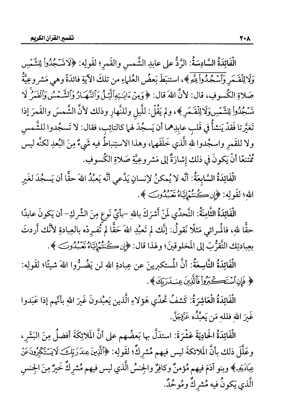 الْفَائِدَةُ السَّادِسَةُ: الرَّدُّ على عابدِ الشَّمسِ والقَمرِ؛ لقَولِه: {لَا تَسْجُدُوا لِلشَّمْسِ وَلَا لِلْقَمَرِ وَاسْجُدُوا لِلَّهِ}، استنبَطَ بَعضُ العُلماءِ من تلكَ الآيَةِ فائدَةً وهي مَشروعِيَّةُ صَلاةِ الكُسوفِ، قال: لأنَّ اللهَ قال: {وَمِنْ آيَاتِهِ اللَّيْلُ وَالنَّهَارُ وَالشَّمْسُ وَالْقَمَرُ لَا تَسْجُدُوا لِلشَّمْسِ وَلَا لِلْقَمَرِ}، ولم يَقُلْ: للَّيلِ وللنَّهارِ وذلك لأنَّ الشَّمسَ والقَمرَ إذا تَغيَّرتا فَقدْ يَنشأُ في قَلبِ عابِدِهما أن يَسجُدَ لهما كالتائِبِ، فقال: لا تَسجُدوا للشَّمسِ ولا للقَمرِ واسجُدوا للهِ الَّذي خَلَقَهما، وهذا الاستِنباطُ فيه شَيءٌ مِنَ البُعدِ لكنَّه ليس مُمْتنعًا أنْ يَكونَ في ذلك إِشارَةٌ إلى مَشروعِيَّةِ صَلاةِ الكُسوفِ.