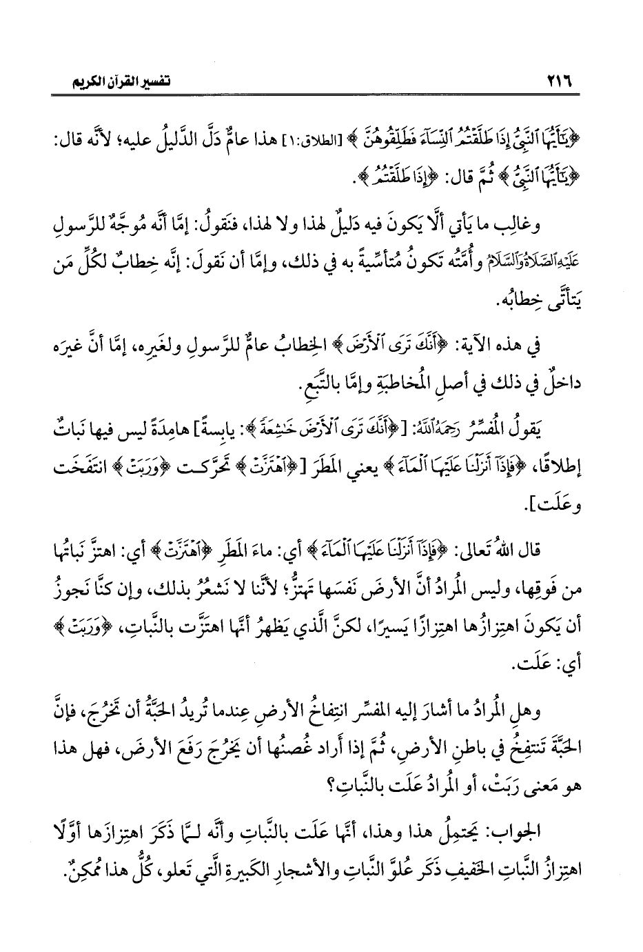 قال اللهُ تَعالى: {فَإِذَا أَنْزَلْنَا عَلَيْهَا الْمَاءَ} أي: ماءَ المَطَرِ {اهْتَزَّتْ} أي: اهتزَّ نَباتُها من فَوقِها، وليس المُرادُ أنَّ الأرضَ نَفسَها تَهتزُّ؛ لأنَّنا لا نَشعُرُ بذلك، وإن كنَّا نَجوزُ أن يَكونَ اهتِزازُها اهتِزازًا يَسيرًا، لكنَّ الَّذي يَظهرُ أنَّها اهتَزَّت بالنَّباتِ، {وَرَبَتْ} أي: عَلَت.