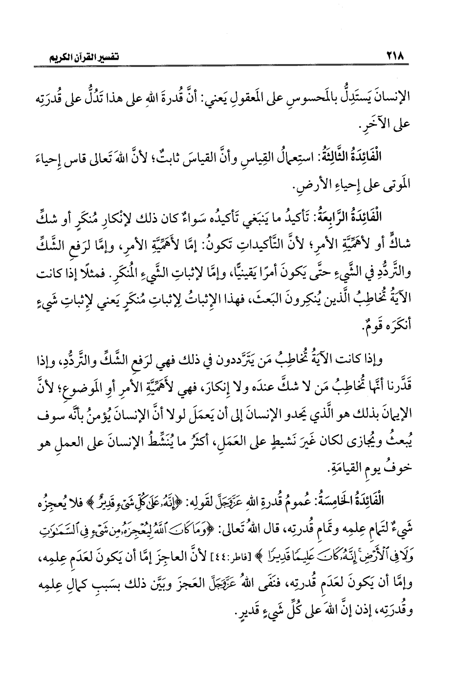 الْفَائِدَةُ الخَامِسَةُ: عُمومُ قُدرةِ اللهِ - عَزَّ وَجَلَّ - لقَولِه: {إِنَّهُ عَلَى كُلِّ شَيْءٍ قَدِيرٌ} فلا يُعجِزُه شَيءٌ لتَمامِ عِلمِه وتمَامِ قُدرتِه، قال اللهُ تَعالى: {وَمَا كَانَ اللَّهُ لِيُعْجِزَهُ مِنْ شَيْءٍ فِي السَّمَاوَاتِ وَلَا فِي الْأَرْضِ إِنَّهُ كَانَ عَلِيمًا قَدِيرًا} [فاطر: ٤٤] لأنَّ العاجِزَ إمَّا أن يَكونَ لعَدَمِ عِلمِه، وإمَّا أن يَكونَ لعَدَمِ قُدرتِه، فنَفَى اللهُ -عَزَّ وَجَلَّ - العَجزَ وبَيَّن ذلك بسَببِ كمالِ عِلمِه وقُدرَتِه، إذن إنَّ اللهَ على كُلِّ شَيءٍ قَديرٍ.