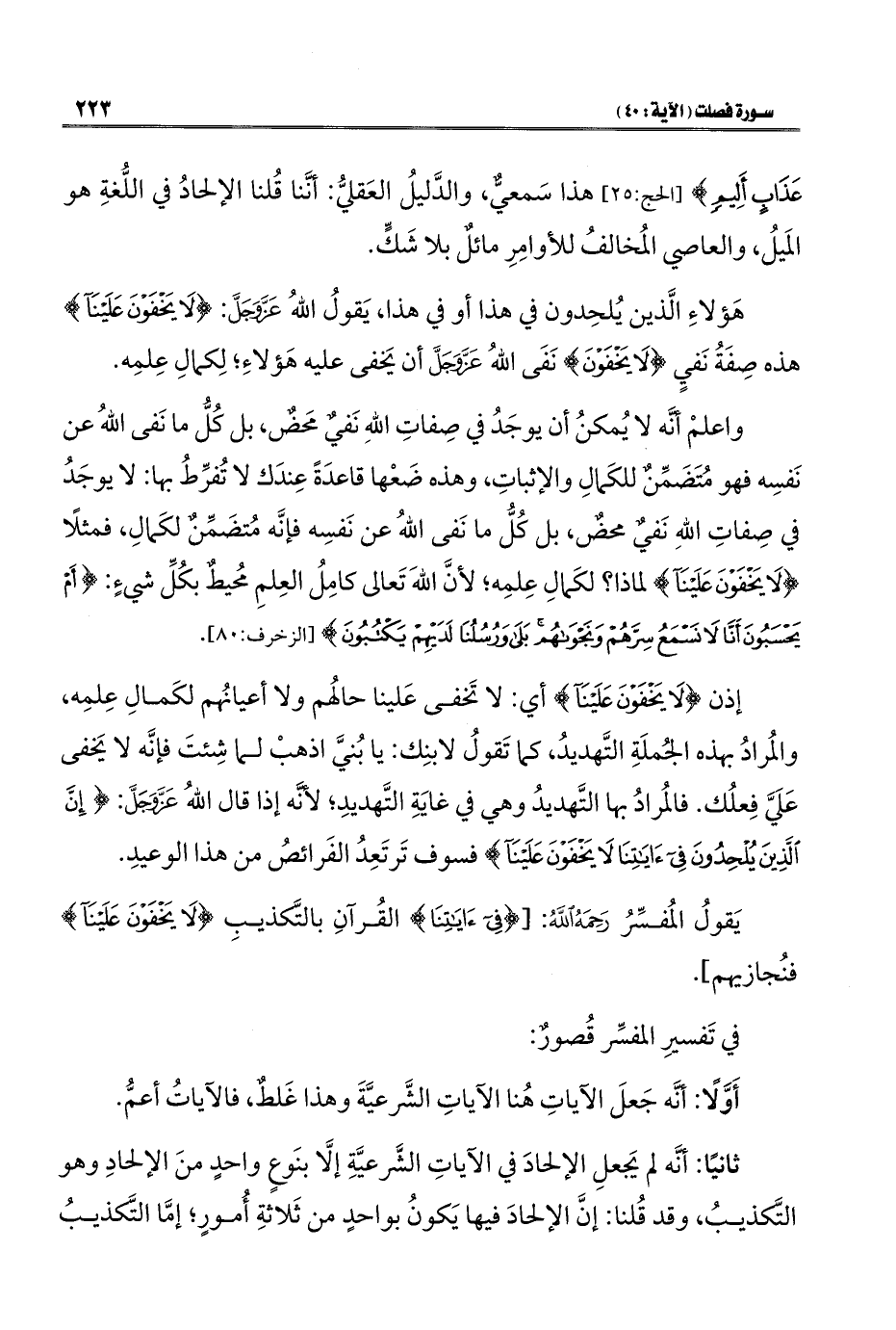 هَؤلاءِ الَّذين يُلحِدون في هذا أو في هذا، يَقولُ اللهُ -عَزَّ وَجَلَّ-: {لَا يَخْفَوْنَ عَلَيْنَا} هذه صِفَةُ نَفيٍ {لَا يَخْفَوْنَ} نَفَى اللهُ -عَزَّ وَجَلَّ- أن يَخفى عليه هَؤلاءِ؛ لِكمالِ عِلمِه.
