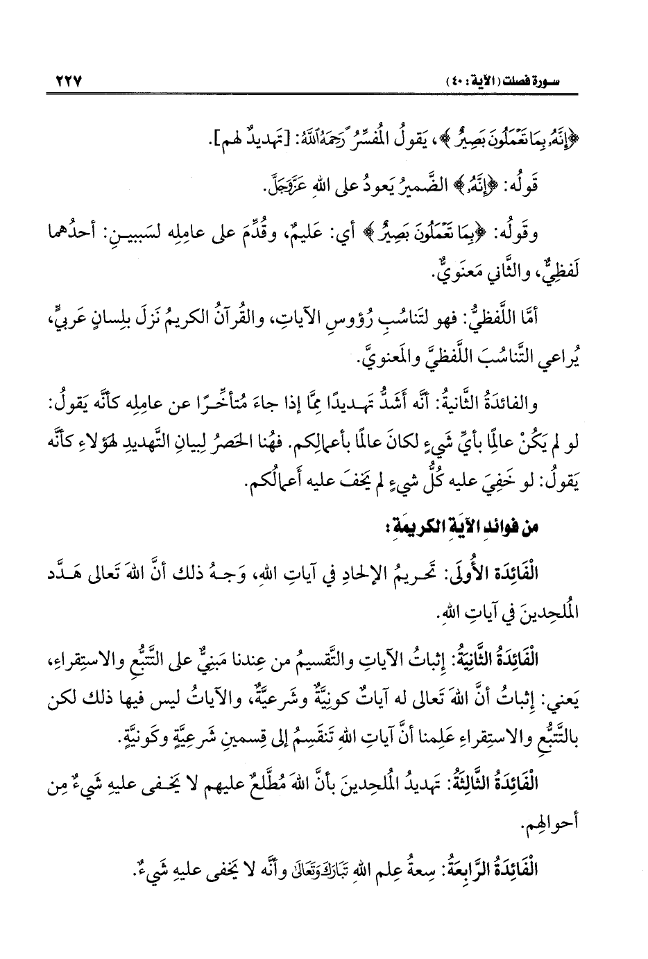 الْفَائِدَة الأُولَى: تَحريمُ الإلحادِ في آياتِ اللهِ، وَجهُ ذلك أنَّ اللهَ تَعالى هَدَّد المُلحِدينَ في آياتِ اللهِ.