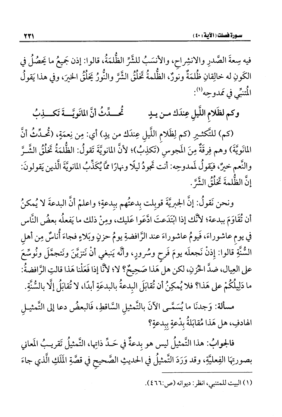 فيه سِعةَ الصَّدرِ والانشِراحِ، والأنسَبُ للشَّرِّ الظُّلمَةُ، قالوا: إذن جَميعُ ما يَحصُلُ في الكَونِ له خالِقانِ ظُلمَةٌ ونورٌ، الظُّلمةُ تَخلُقُ الشَّرَّ والنُّورُ يَخلُقُ الخيرَ، وفي هذا يَقولُ المُتنبِّي في مَمدوحِه (¬١):