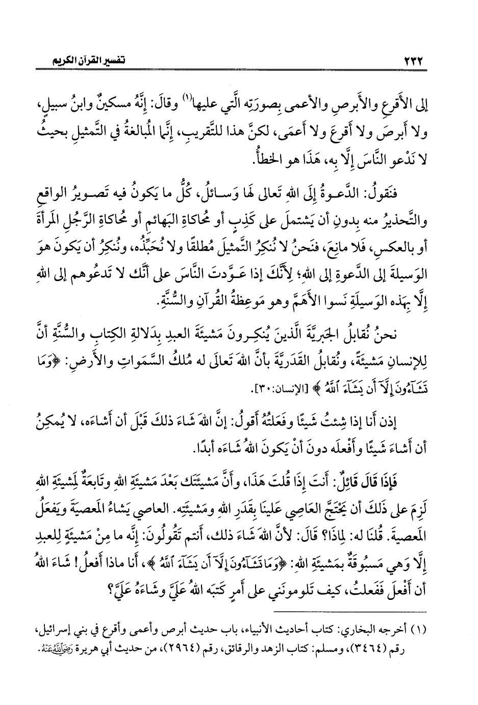 فَإذَا قَالَ قَائِلٌ: أَنتَ إِذَا قُلتَ هَذَا، وأَنَّ مَشيئَتَك بَعْدَ مَشيئَةِ اللهِ وتَابعَةٌ لِمَشيئَةِ اللهِ لَزِمَ على ذَلكَ أن يَحْتَجَّ العَاصِي عَلينَا بِقَدَرِ اللهِ ومَشيئَتِه. العاصي يَشاءُ المَعصيَةَ وَيفعَلُ المَعصيةَ. قُلنَا له: لمِاذَا؟ قَالَ: لأنَّ اللهَ شَاءَ ذلك، أَنتم تَقُولُونَ: إِنَّه ما مِنْ مَشيئَةٍ لِلعبدِ إِلَّا وَهي مَسبُوقَةٌ بمَشيئَةِ اللهِ: {وَمَا تَشَاءُونَ إِلَّا أَنْ يَشَاءَ اللَّهُ}، أَنا ماذا أَفعلُ! شَاءَ اللهُ أن أَفْعلَ فَفَعلتُ، كيف تَلومونَني على أَمرٍ كَتبَه اللهُ عَلَيَّ وشَاءَهُ عَلَيَّ؟
