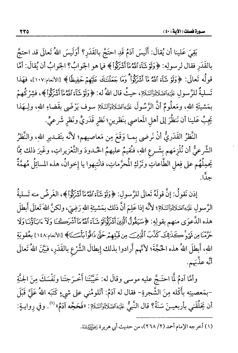 بَقِيَ عَلينا أن يُقالَ: أَلَيسَ آدَمُ قَدِ احتَجَّ بالقَدَرِ؟ أَوَلَيسَ اللهُ تَعالَى قد احتجَّ بالقَدَرِ فقال لرسولِه: {وَلَوْ شَاءَ اللَّهُ مَا أَشْرَكُوا} فما هو الجَوابُ؟ الجَوابُ أن يُقالَ: أمَّا قولُه تَعالَى: {وَلَوْ شَاءَ اللَّهُ مَا أَشْرَكُوا وَمَا جَعَلْنَاكَ عَلَيْهِمْ حَفِيظًا} [الأنعام: ١٠٧]، فهَذا تَسليةٌ للرَّسولِ عَلَيْهِ الصَّلَاةُ وَالسَّلَامُ، حيثُ قال اللهُ له: {وَلَوْ شَاءَ اللَّهُ مَا أَشْرَكُوا}، فشِرْكُهمْ بمَشيئَةِ اللهِ، ومَعلُومٌ أنَّ الرَّسُولَ عَلَيْهَ الصَّلَاةُ وَالسَّلَامُ سوف يَرْضَى بقَضاءِ اللهِ، ولِهَذا يَجِبُ عَلينا أن نَنظُرَ إلى أهلِ المَعاصي بنَظرينِ؛ نَظرٍ قَدَريٍّ ونَظرٍ شَرعيٍّ.