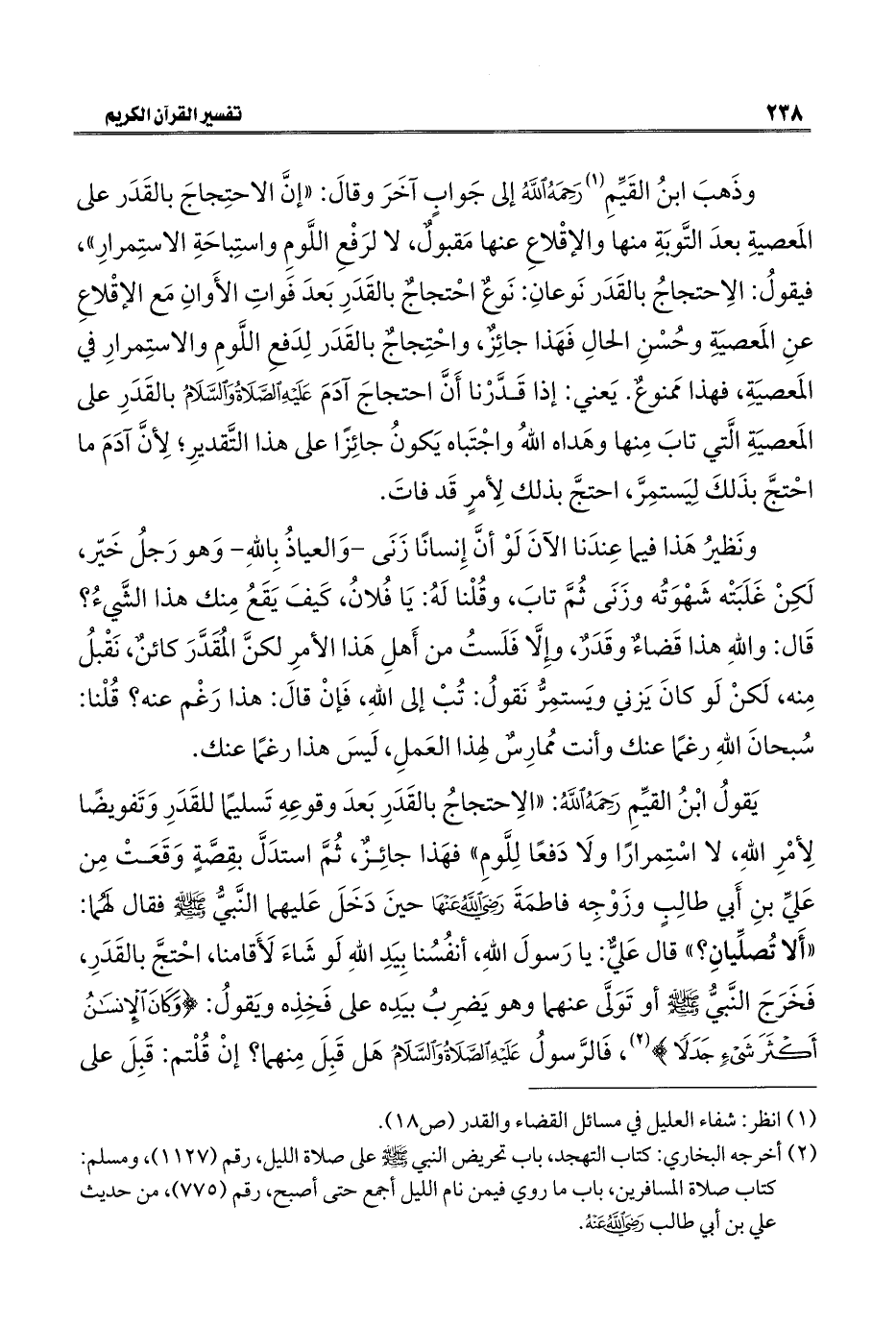 يَقولُ ابْنُ القيِّمِ رَحِمَهُ اللهُ: "الِاحتجاجُ بالقَدَرِ بَعدَ وقوعِهِ تَسليمًا للقَدَرِ وَتَفويضًا لِأمْرِ اللهِ، لا اسْتِمرارًا ولَا دَفعًا لِلَّومِ" فهَذا جائِزٌ، ثُمَّ استدَلَّ بقِصَّةٍ وَقَعَتْ مِن عَليِّ بنِ أَبي طالِبٍ وزَوْجِه فاطمَةَ - رضي الله عنها - حينَ دَخَلَ عَليهما النَّبيُّ - صلى الله عليه وسلم - فقال لَهُما: "أَلا تُصلِّيانِ؟ " قال عَليٌّ: يا رَسولَ اللهِ، أنفُسُنا بِيَدِ اللهِ لَو شَاءَ لَأَقامنا، احْتجَّ بالقَدَرِ، فَخَرَجَ النَّبيُّ - صلى الله عليه وسلم - أو تَوَلَّى عنهما وهو يَضرِبُ بيَدِه على فَخِذِه ويَقولُ: {وَكَانَ الْإِنْسَانُ أَكْثَرَ شَيْءٍ جَدَلًا} (¬٢)، فَالرَّسولُ عَلَيْهِ الصَّلَاةُ وَالسَّلَامُ هَل قَبِلَ مِنهما؟ إنْ قُلْتم: قَبِلَ على