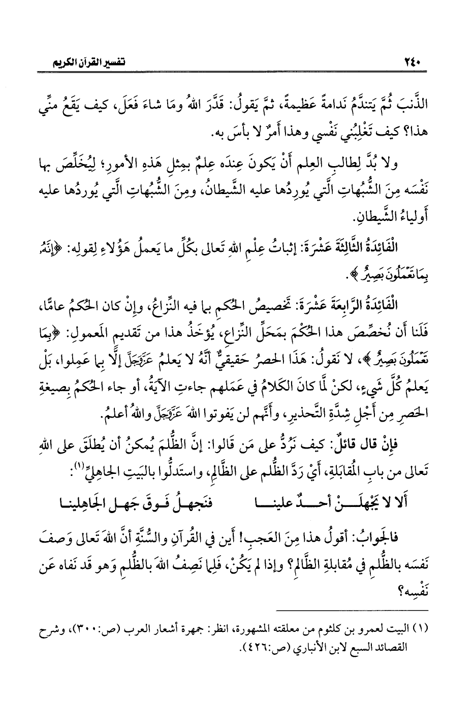 الْفَائِدَةُ الرَّابِعَةَ عَشْرَةَ: تَخصيصُ الحُكمِ بما فيه النِّزاءُ، وإِنْ كان الحُكمُ عامًّا، فَلَنا أَن نُخصِّصَ هذا الحُكْمَ بمَحَلِّ النِّزاعِ، يُؤخَذُ هذا من تَقديمِ المَعمولِ: {بِمَا تَعْمَلُونَ بَصِيرٌ}، لا نَقولُ: هَذَا الحصرُ حَقيقيٌّ أنَّهُ لا يَعلمُ -عَزَّ وَجَلَّ- إلَّا بِما عَمِلوا، بَلْ يَعلمُ كُلَّ شَيءٍ، لكنْ لمَّا كانَ الكَلامُ في عَمَلهم جاءتِ الآيَةُ، أو جاء الحُكمُ بِصيغةِ الحَصرِ مِن أَجْلِ شِدَّةِ التَّحذيرِ، وأَنَّهم لن يَفوتوا اللهَ - عَزَّ وَجَلَّ - واللهُ أعلمُ.