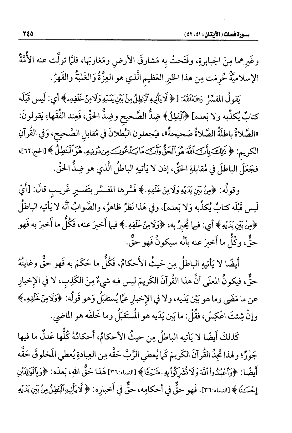 يَقولُ المفسِّرُ رَحِمَهُ اللهُ: [{لَا يَأْتِيهِ الْبَاطِلُ مِنْ بَيْنِ يَدَيْهِ وَلَا مِنْ خَلْفِهِ} أي: لَيس قَبْلَه كتابٌ يُكذِّبه ولا بَعده] {الْبَاطِلُ} ضِدُّ الصَّحيحِ وضِدُّ الحقِّ، فَعِند الفُقَهاءِ يَقولونَ: "الصَّلاةُ باطلَةٌ الصَّلاةُ صَحيحةٌ"، فيَجعلون البُطلانَ في مُقابلِ الصَّحيحِ، وَفي القُرآنِ الكريمِ: {ذَلِكَ بِأَنَّ اللَّهَ هُوَ الْحَقُّ وَأَنَّ مَا يَدْعُونَ مِنْ دُونِهِ هُوَ الْبَاطِلُ} [الحج: ٦٢]، فجَعَلَ الباطلَ في مُقابلةِ الحَقَّ، إذن لا يَأتيهِ الباطلُ الَّذي هو ضِدُّ الحقِّ.