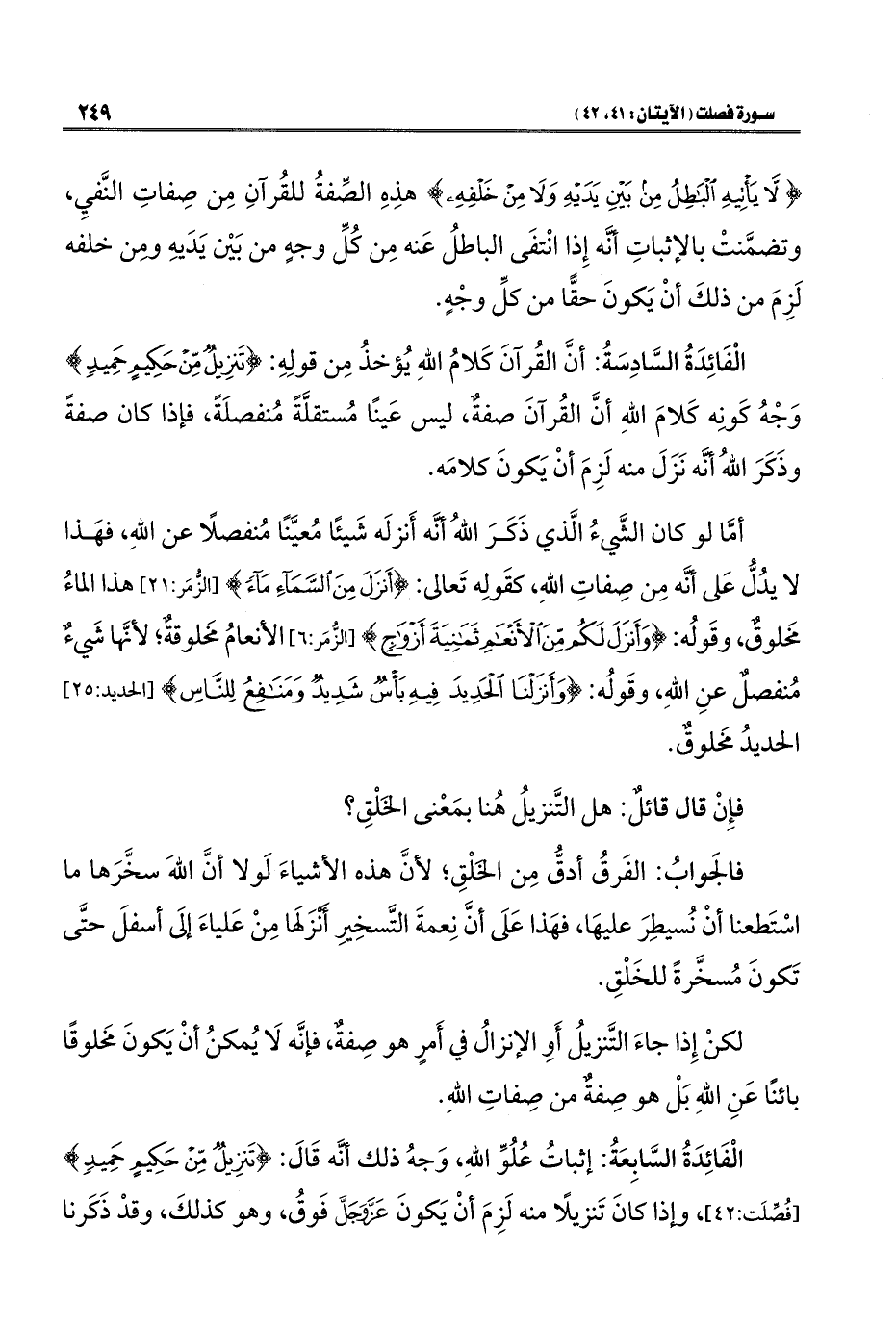 لكنْ إِذا جاءَ التَّنزيلُ أَوِ الإنزالُ في أَمرٍ هو صِفةٌ، فإنَّه لَا يُمكنُ أنْ يَكونَ مَخلوقًا بائنًا عَنِ اللهِ بَلْ هو صِفةٌ من صِفاتِ اللهِ.