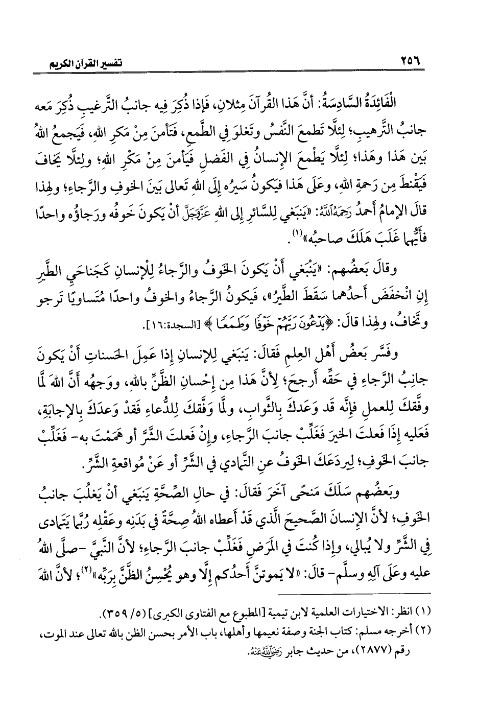 الْفَائِدَةُ السَّادِسَةُ: أنَّ هَذا القُرآنَ مِثلانِ، فَإذا ذُكِرَ فِيه جانبُ التَّرغيبِ ذُكِرَ مَعه جانبُ التَّرهيبِ؛ لِئلَّا تَطمعَ النَّفسُ وتَغلوَ فِي الطَّمعِ، فَتَأمنَ مِنْ مَكرِ اللهِ، فَيَجمعُ اللهُ بَين هَذا وهَذا؛ لِئلَّا يَطْمعَ الإِنسانُ فِي الفَضلِ فَيَأمنَ مِنْ مَكْرِ اللهِ؛ ولِئلَّا يَخافَ فَيَقْنطَ مِن رَحمةِ اللهِ، وعَلَى هَذا فيَكونُ سَيرُه إِلَى اللهِ تَعالى بَينَ الخوفِ والرَّجاءِ؛ ولهِذا قَالَ الإمامُ أَحمدُ - رَحِمَهُ اللهُ -: "يَنبَغي لِلسَّائرِ إِلى اللهِ - عَزَّ وَجَلَّ - أنْ يَكونَ خَوفُه ورَجاؤُه واحدًا فأَيُّهما غَلَبَ هَلَكَ صاحبُه" (¬١).