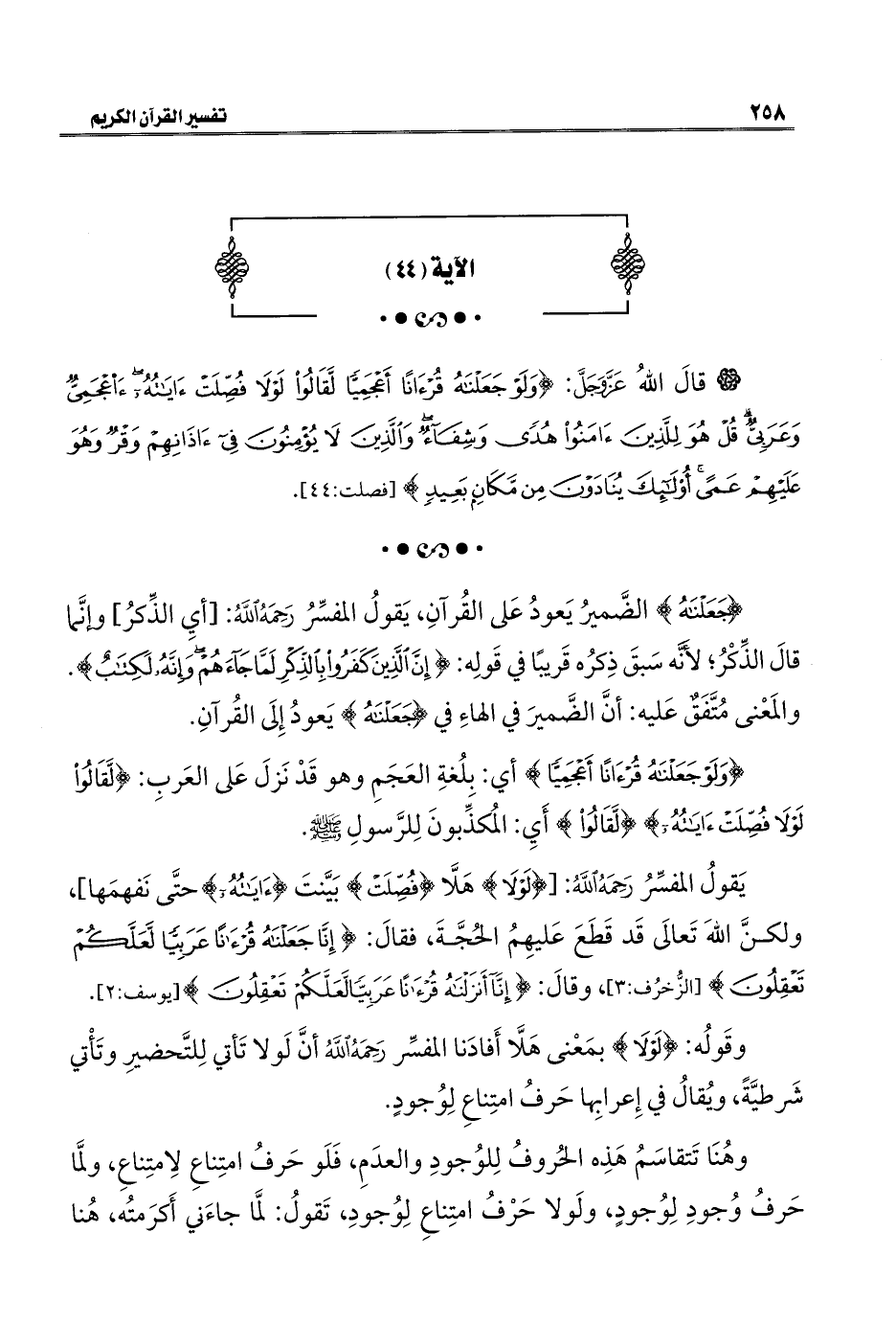 يَقولُ المفسِّرُ - رَحِمَهُ اللهُ -: [{لَوْلَا} هَلَّا {فُصِّلَتْ} بَيَّنتَ {آيَاتُهُ} حتَّى نَفهمَها]، ولكنَّ الله تَعالَى قَد قَطَعَ عَليهِمُ الحُجَّةَ، فقالَ: {إِنَّا جَعَلْنَاهُ قُرْآنًا عَرَبِيًّا لَعَلَّكُمْ تَعْقِلُونَ} [الزخرف: ٣]، وقالَ: {إِنَّا أَنْزَلْنَاهُ قُرْآنًا عَرَبِيًّا لَعَلَّكُمْ تَعْقِلُونَ} [يوسف: ٢].