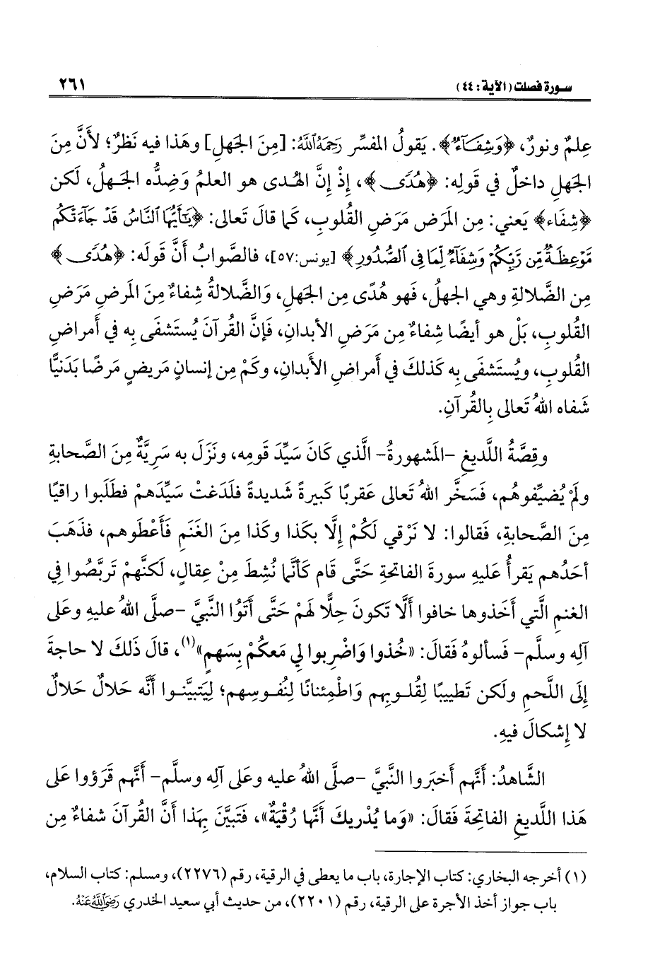 الشَّاهدُ: أَنَّهم أَخبَروا النَّبيَّ - صلَّى اللهُ عليه وعَلى آلِه وسلَّم - أَنَّهم قَرَؤوا عَلى هَذا اللَّديغِ الفاتِحةَ فَقالَ: "وَما يُدْريكَ أَنَّها رُقْيَةٌ"، فَتَبيَّنَ بِهَذا أَنَّ القُرآنَ شفاءٌ مِن