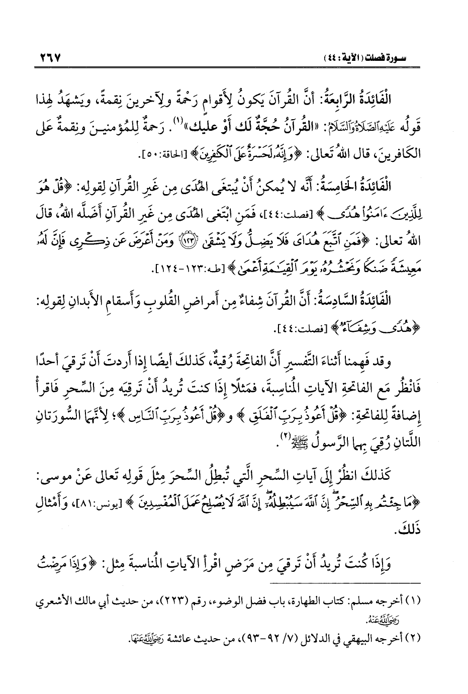 الْفَائِدَةُ السَّادِسَةُ: أَنَّ القُرآنَ شِفاءٌ مِن أَمراضِ القُلوبِ وَأَسقامِ الأَبدانِ لِقولِه: {هُدًى وَشِفَاءٌ} [فصلت: ٤٤].