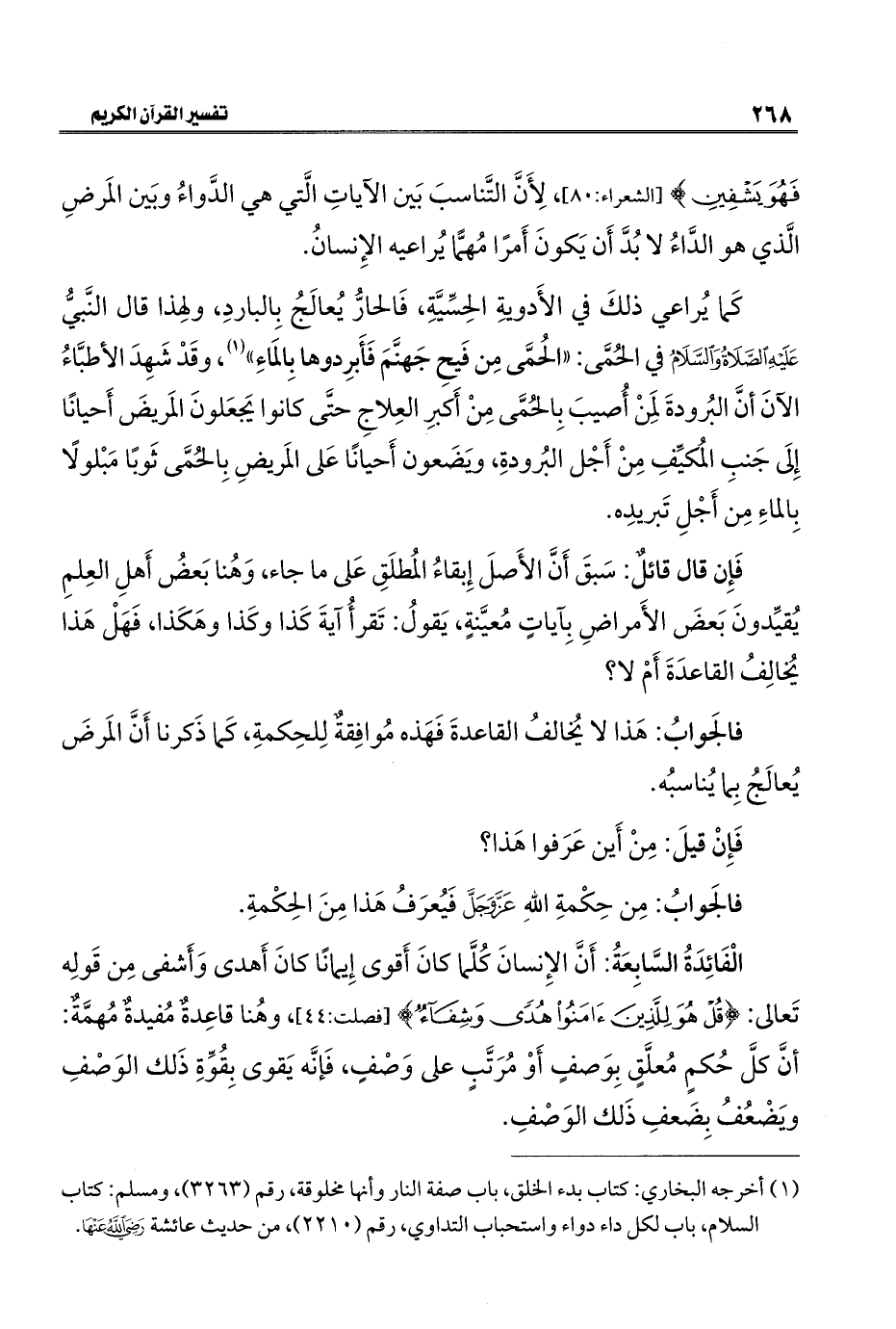 فَهُوَ يَشْفِينِ} [الشعراء: ٨٠]، لِأَنَّ التَّناسبَ بَين الآياتِ الَّتي هي الدَّواءُ وبَين المَرضِ الَّذي هو الدَّاءُ لا بُدَّ أَن يَكونَ أَمرًا مُهمًّا يُراعيه الإِنسانُ.