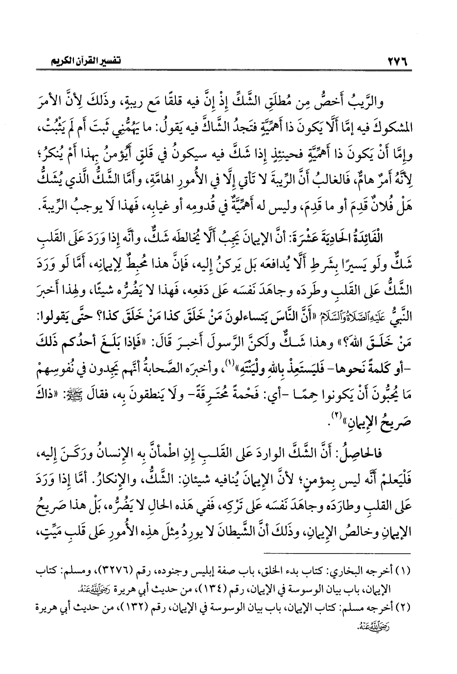 فالحاصِلُ: أَنَّ الشَّكَّ الواردَ عَلى القَلبِ إِنِ اطْمأنَّ بِه الإِنسانُ ورَكَنَ إِليه، فَلْيَعلمْ أَنَّه ليس بِمؤمنٍ؛ لأنَّ الإِيمانَ يُنافيه شيئانِ: الشَّكُّ، والإِنكارُ. أمَّا إِذا وَرَدَ عَلى القلبِ وطارَدَه وجاهَدَ نَفسَه عَلى تَرْكِه، فَفي هَذه الحالِ لا يَضُرُّه، بَلْ هذا صَريحُ الإيمانِ وخالصُ الإِيمانِ، وذَلكَ أنَّ الشَّيطانَ لا يورِدُ مِثلَ هذِه الأُمورِ عَلى قَلبِ مَيِّتٍ،
