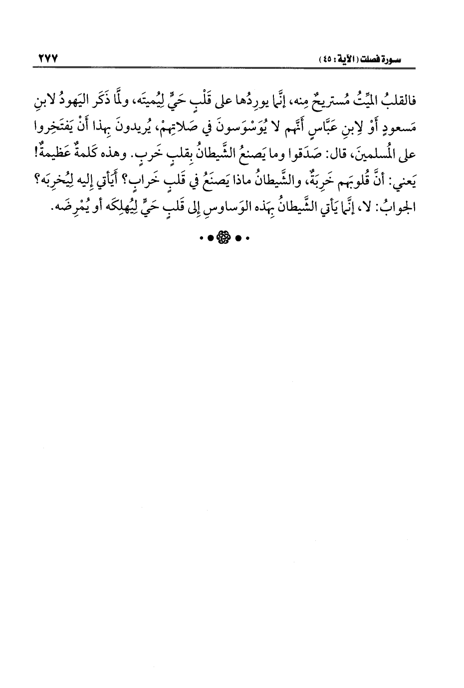 فالقلبُ الميِّتُ مُستريحٌ مِنه، إنَّما يورِدُها على قَلْبٍ حَيٍّ لِيُميتَه، ولمَّا ذَكَر اليَهودُ لابنِ مَسعودٍ أَوْ لِابنِ عَبَّاسٍ أَنَّهم لا يُوَسْوَسونَ في صَلاتِهمْ، يُريدونَ بِهذا أَنْ يَفتَخِروا على المُسلمينَ، قال: صَدَقوا وما يَصنعُ الشَّيطانُ بِقلبٍ خَربٍ. وهذه كَلمةٌ عَظيمةٌ! يَعني: أنَّ قُلوبَهم خَرِبَةٌ، والشَّيطانُ ماذا يَصنَعُ في قَلبٍ خَرابٍ؟ أَيَأتي إِليه لِيُخرِبَه؟ الجوابُ: لا، إنَّما يَأتي الشَّيطانُ بِهَذه الوَساوسِ إِلى قَلبٍ حَيٍّ لِيُهلِكَه أو يُمْرِضَه.