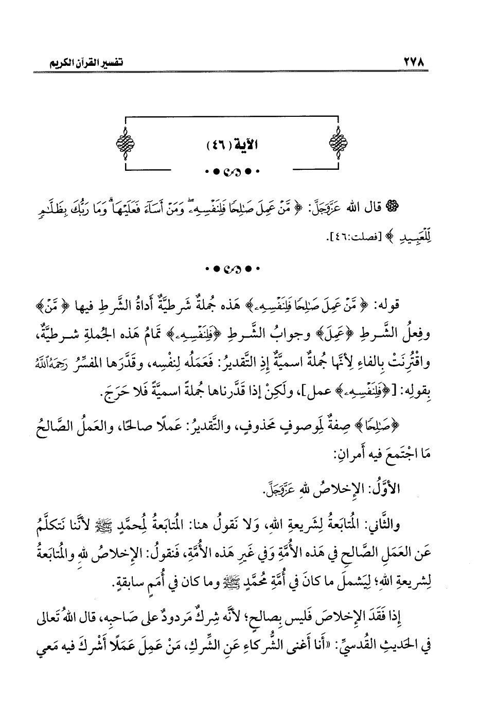 قوله: {مَنْ عَمِلَ صَالِحًا فَلِنَفْسِهِ} هَذه جُملةٌ شَرطيَّةٌ أَداةُ الشَّرطِ فيها {مَنْ} وفِعلُ الشَّرطِ {عَمِلَ} وجوابُ الشَّرطِ {فَلِنَفْسِهِ} تَمامُ هَذه الجُملةِ شرطيَّةٌ، واقْتُرِنَتْ بِالفاءِ لِأنَّها جُملةٌ اسميَّةٌ إِذِ التَّقديرُ: فَعَمَلُه لِنفْسِه، وقَدَّرَها المفسِّرُ - رَحِمَهُ اللهُ - بِقولِه: [{فَلِنَفْسِهِ} عمل]، ولَكِنْ إذا قَدَّرناها جُملةً اسميَّةً فَلا حَرَجَ.