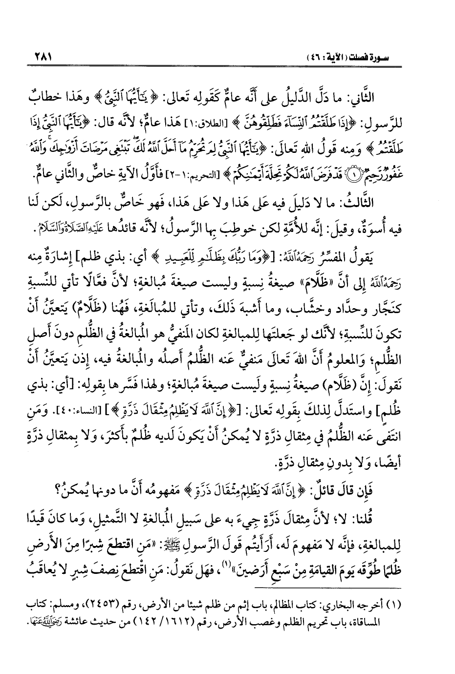 يَقولُ المفسِّرُ - رَحِمَهُ اللهُ -: [{وَمَا رَبُّكَ بِظَلَّامٍ لِلْعَبِيدِ} أي: بذي ظلم] إِشارَةٌ مِنه - رَحِمَهُ اللهُ - إِلى أنَّ "ظَلَّامَ" صيغةُ نِسبةٍ وليست صيغةَ مُبالغةٍ؛ لأنَّ فعَّالًا تأتي للنِّسبةِ كنَجَّار وحدَّاد وخشَّاب، وما أَشبهَ ذَلكَ، وتأتي للمُبالَغةِ، فَهُنا (ظَلَّامٌ) يَتعيَّنُ أَنْ تكونَ للنِّسبةِ؛ لأنَّك لو جَعلتَها لِلمبالغةِ لكان المَنفيُّ هو المُبالغةُ في الظُّلمِ دونَ أَصلِ الظُّلمِ؛ وَالمعلومُ أَنَّ اللهَ تَعالَى مَنفيٌّ عَنه الظُّلمُ أَصلُه والمُبالغةُ فيه، إِذن يَتعيَّنُ أَنْ نَقولَ: إِنَّ (ظَلَّام) صيغةُ نِسبةٍ ولَيست صيغةَ مُبالغةٍ؛ ولهذا فَسَّرها بِقولِه: [أي: بذي ظُلمٍ] واستَدلَّ لِذلكَ بِقَولِه تَعالى: [{إِنَّ اللَّهَ لَا يَظْلِمُ مِثْقَالَ ذَرَّةٍ} [النساء: ٤٠]. وَمَنِ انتَفى عَنه الظُّلمُ في مِثقالِ ذرَّةٍ لا يُمكنُ أَنْ يَكونَ لَديه ظُلمٌ بأَكثرَ، وَلا بِمثقالِ ذرَّةٍ أيضًا، وَلا بِدونِ مِثقالِ ذرَّةٍ.