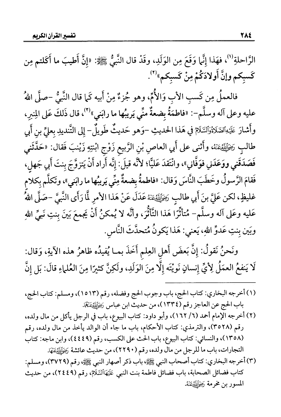 فالعملُ مِن كَسبِ الأبِ وَالأُمِّ، وهو جُزءٌ مِنْ أَبيه كَما قال النَّبيُّ - صلَّى اللهُ عليه وعلى آله وسلَّم -: "فاطمَةُ بِضعةٌ منِّي يَريبُها ما رابَني" (¬٣)، قال ذَلكَ عَلى المِنبرِ، وأَشارَ - عَلَيْهِ الصَّلَاةُ وَالسَّلَامُ - في هَذا الحديثِ - وَهو حَديثٌ طَويلٌ - إِلى التَّنديدِ بِعليِّ بنِ أَبي طالبٍ - رضي الله عنه -، وأَثنى على أَبي العاصِ بْنِ الرَّبيعِ زَوْجِ ابْنتِهِ زَيْنبَ فَقال: "حَدَّثَني فَصَدَقَني ووَعَدَني فوَفَّاني"، وانْتَقدَ عَليًّا؛ لأنَّه قيلَ: إِنَّه أَراد أَنْ يَتزوَّجَ بِنتَ أَبي جَهلٍ، فَقامَ الرَّسولُ وخَطَبَ النَّاسَ وَقال: "فاطمةُ بِضعةٌ مِنِّي يَريبُها ما رابَني"، وتَكلَّم بِكلامٍ غليظٍ، لكن عَليَّ بنَ أَبي طالبٍ - رضي الله عنه - عَدَلَ عَنْ هَذا الأمرِ لمَّا رَأَى النَّبيَّ - صَلَّى اللهُ عَليه وعَلى آله وسلَّم - مُتأثِّرًا هَذا التَّأثُّرَ، وأنَّه لا يُمكنُ أَنْ يَجمعَ بَينَ بِنتِ نَبيِّ اللهِ وبَين بِنتِ عَدوِّ اللهِ، يَعني: هَذا يَكونُ مُتحدَّثَ النَّاسِ.