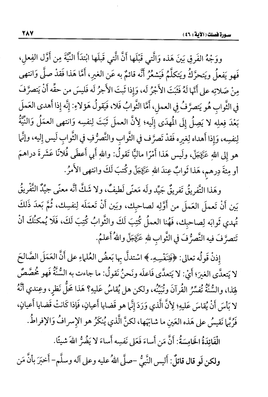 إِذنْ قَولُه تعالى: {فَلِنَفْسِهِ} اسْتدلَّ بِها بَعضُ العُلماءِ على أَنَّ العَمَلَ الصَّالحَ لا يَتعدَّى الغيرَ؛ أَيْ: لا يَتعدَّى فَاعلَه ونَحنُ نَقولُ: ما جاءت به السُّنَّةُ فَهو مُخصَّصٌ لِهَذا، والسُّنَّةُ تُفسِّرُ القُرآنَ وتُبَيِّنُه، ولكن هل يُقاسُ عَليهِ؟ هَذا مَحلُّ نَظرٍ، وعِندي أنَّهُ لا بَأسَ أَنْ يُقاسَ عَليهِ؛ لِأنَّ الَّذي وَرَدَ إِنَّما هو قَضايا أَعيانٍ، فَإذا كَانتْ قَضايا أَعيانٍ، فَرُبَّما نَقيسُ على هَذه العَينِ ما شابَهَها، لكنَّ الَّذي يُنكَرُ هو الإِسرافُ وَالإفراطُ.