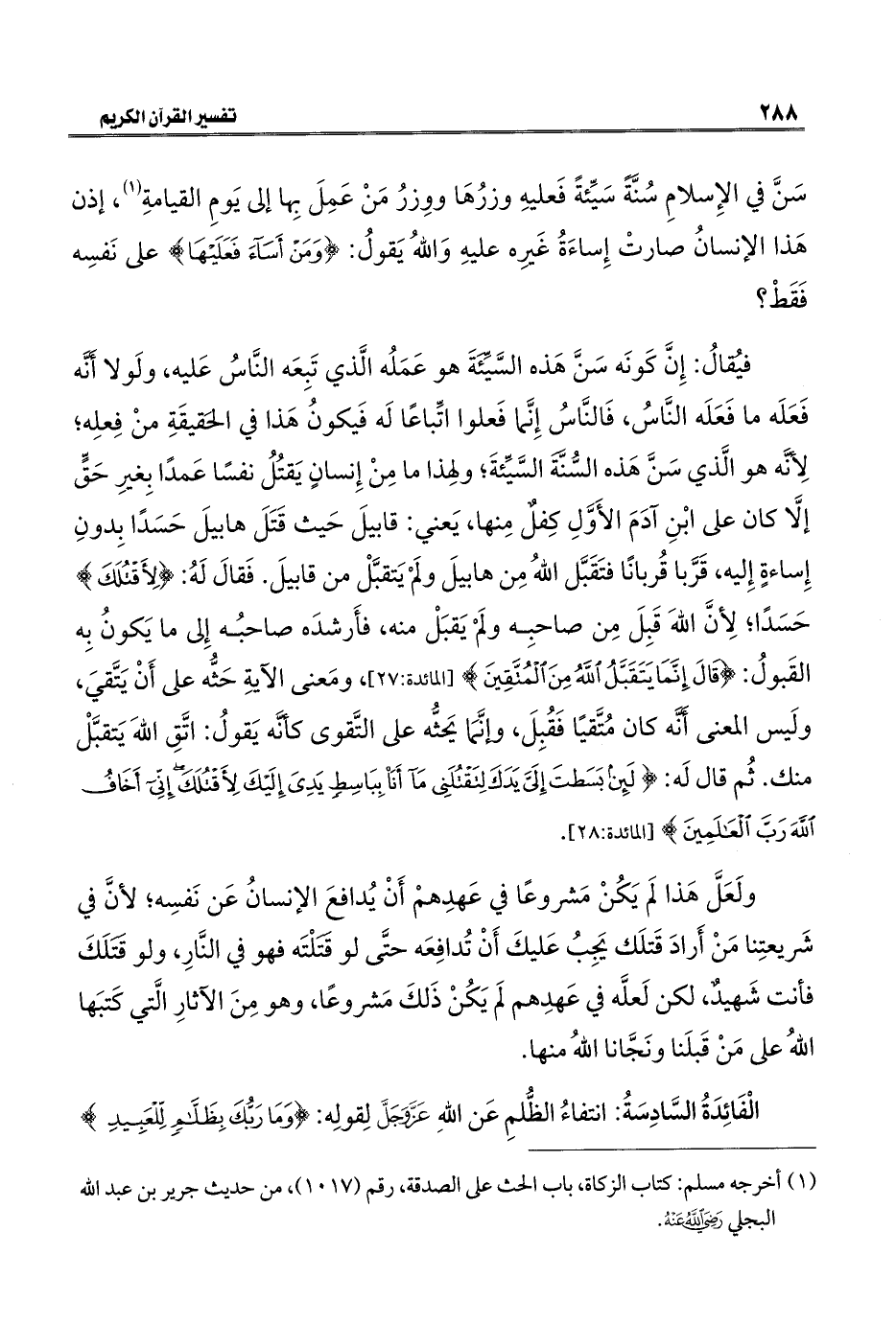 فيُقالُ: إِنَّ كَونَه سَنَّ هَذه السَّيِّئَةَ هو عَمَلُه الَّذي تَبِعَه النَّاسُ عَليه، ولَولا أَنَّه فَعَلَه ما فَعَلَه النَّاسُ، فَالنَّاسُ إِنَّما فَعلوا اتِّباعًا لَه فَيكونُ هَذا في الحَقيقَةِ منْ فِعلِه؛ لِأنَّه هو الَّذي سَنَّ هَذه السُّنَّةَ السَّيِّئةَ؛ ولِهذا ما مِنْ إِنسانٍ يَقتُلُ نفسًا عَمدًا بِغيرِ حَقٍّ إلَّا كان على ابْنِ آدَمَ الأَوَّلِ كِفلٌ مِنها، يَعني: قابيلَ حَيث قَتَلَ هابيلَ حَسَدًا بِدونِ إِساءةٍ إِليه، قَرَّبا قُربانًا فتَقَبَّل اللهُ مِن هابيلَ ولَمْ يَتقبَّلْ من قابيلَ. فَقالَ لَهُ: {لِأَقْتُلَكَ} حَسَدًا؛ لِأنَّ اللهَ قَبِلَ مِن صاحبِه ولَمْ يَقبَلْ منه، فأَرشدَه صاحبُه إِلى ما يَكونُ بِه القَبولُ: {قَالَ إِنَّمَا يَتَقَبَّلُ اللَّهُ مِنَ الْمُتَّقِينَ} [المائدة: ٢٧]، ومَعنى الآيةِ حَثُّه على أَنْ يَتَّقيَ، ولَيس المعنى أَنَّه كان مُتَّقيًا فَقُبِلَ، وإنَّمَا يَحثُّه على التَّقوى كأنَّه يَقولُ: اتَّقِ اللهَ يَتقبَّلْ منك. ثُم قال لَه: {لَئِنْ بَسَطْتَ إِلَيَّ يَدَكَ لِتَقْتُلَنِي مَا أَنَا بِبَاسِطٍ يَدِيَ إِلَيْكَ لِأَقْتُلَكَ إِنِّي أَخَافُ اللَّهَ رَبَّ الْعَالَمِينَ} [المائدة: ٢٨].